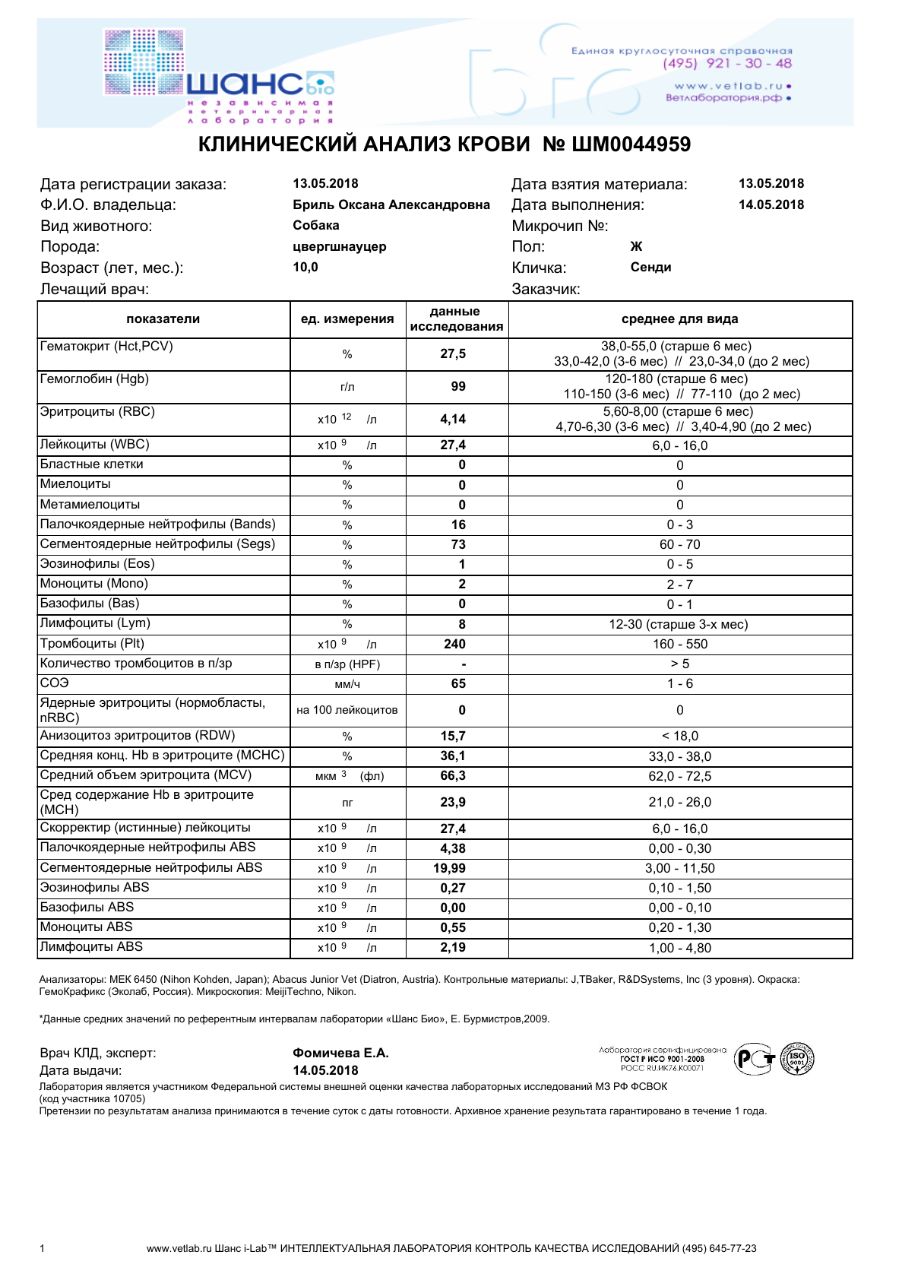У Дуськи анализы были похожие, даже хуже - у неё, в отличие от этой цвергуши, некоторые биохимические показатели тоже уже слегка поехали. Тем не менее, нам разрешили подождать полтора дня и прооперироваться у хорошего врача. Конечно, ждали только под антибиотиком! И капельницу поддерживающую мы тоже делали.