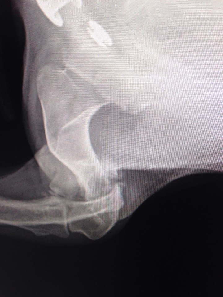 Этот перелом не был должным образом пролечен. Собаке нужно было выполнить хирургическое лечение, так как такие переломы лечатся только оперативно. Все внутрисоставные переломы должны быть хирургически собраны максимально точно. Это обеспечивает полноценность работы сустава. Если нет адекватного анатомического сопоставления, будет развиваться остеоартрит, сустав придет в негодность. В данном случае собаке просто наложили гипс. За прошедшее время поверхности срослись в том виде, в каком были при переломе. Сустав полностью был разрушен.