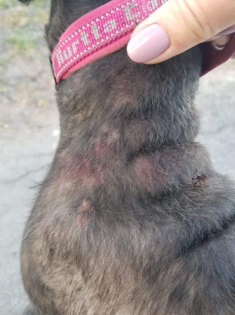 Очаг на ухе и на загривке обнаружила одновременно. Но на загривке была язва похоже в месте укола фортикарба и эта язва на хлоргексидине очень быстро ушла - с субботы до вторника почти зажила, так же ушли и пятна/шишки. А вот на ухе очаг увеличился от первоначального и не уменьшается. Корок только на не  нет. При обработке безболезненно.