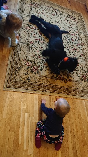 Ребёнок 3-х летний на ней прыгает, лежит, лечит, играет, командует, обучает, кормит. С котами не встречались. Издалека только был интерес и любопытство. С собаками доброжелательна и игрива. К незнакомым людям относится с интересом.