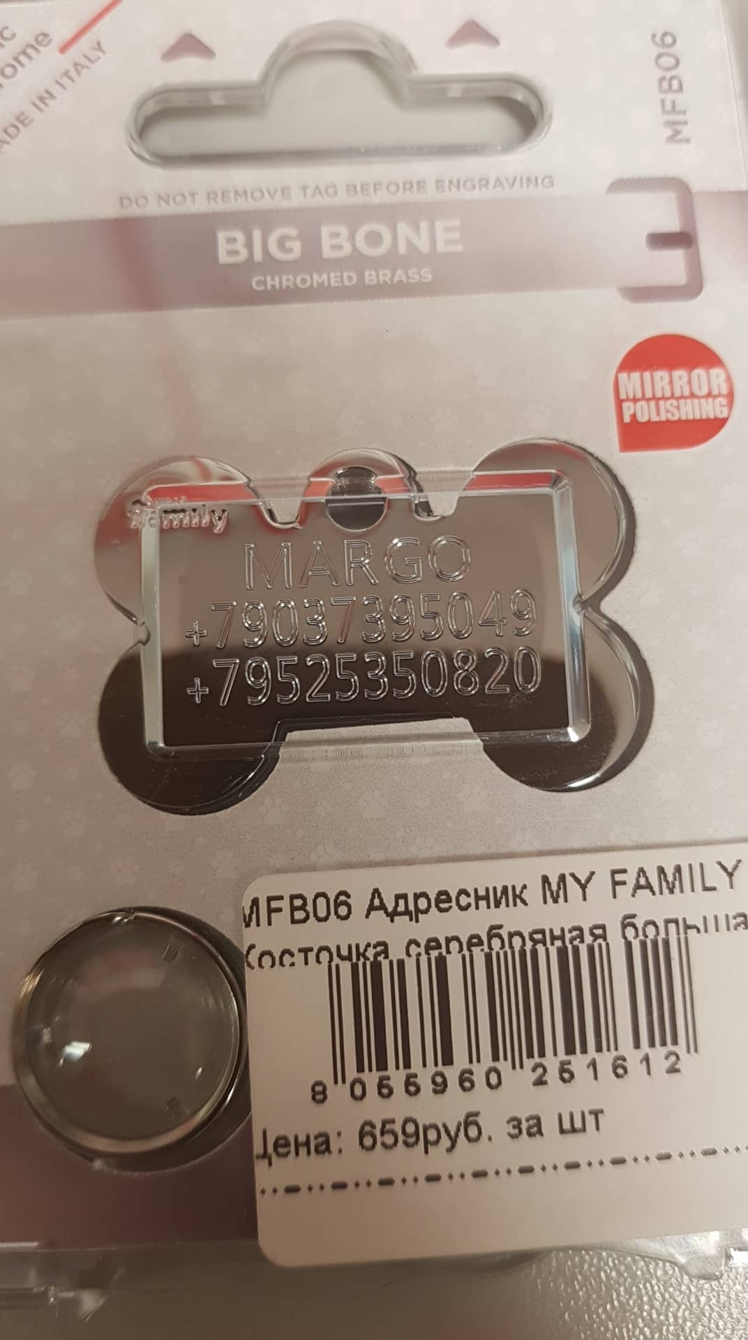 АДресник с гравировкой двух действующих телефонов с кодом России +7 прицепите еще на ошейник намертво на кольцо для ключей, которое очень плотно держит.