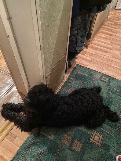 Если не находит никого из них, то тогда уже ложится на тапок и охраняет его