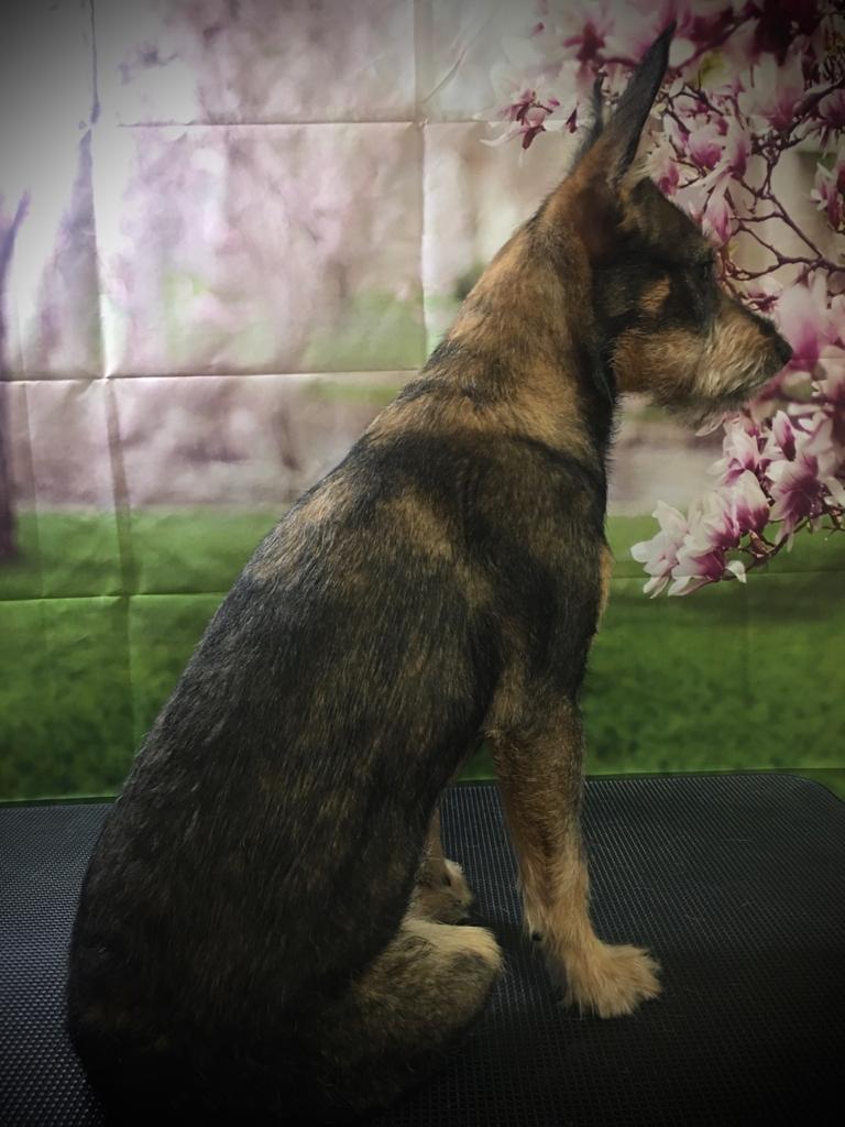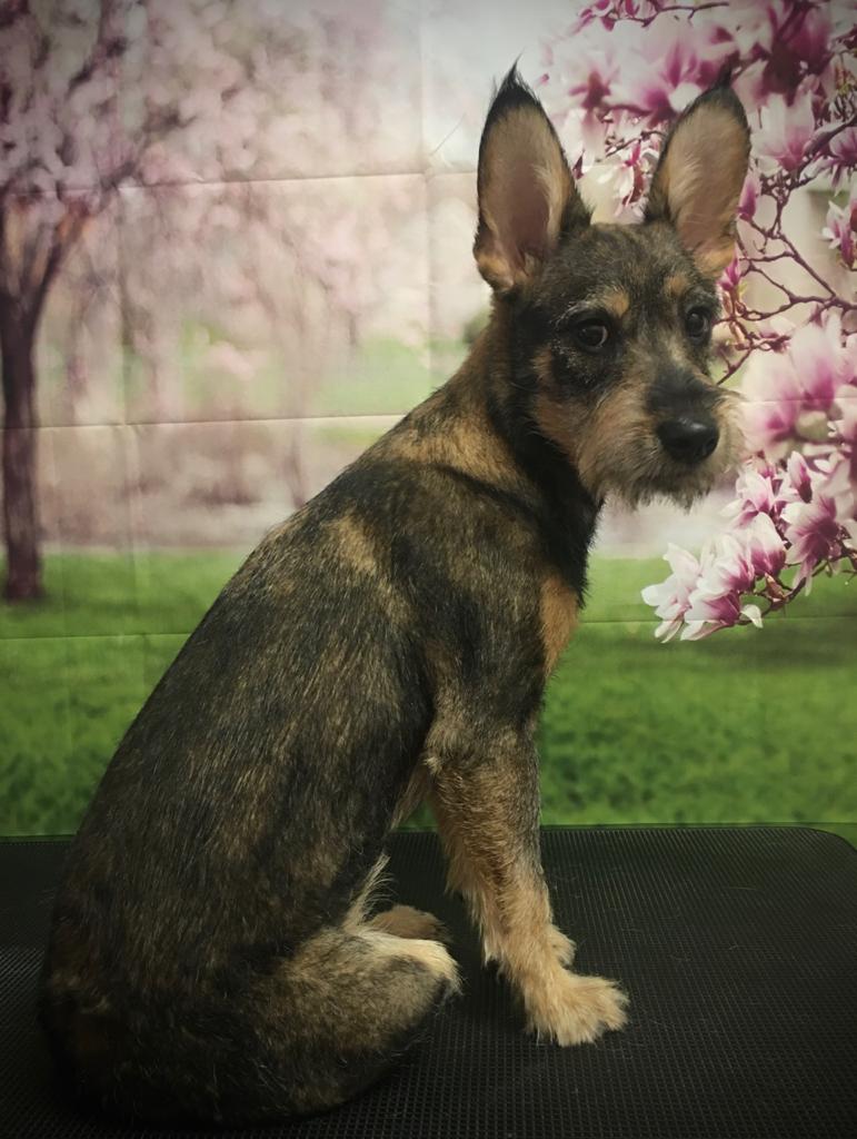 По моему мнению - похожа на метиса шнауцера. Лучше видно по фотографии в стойке.