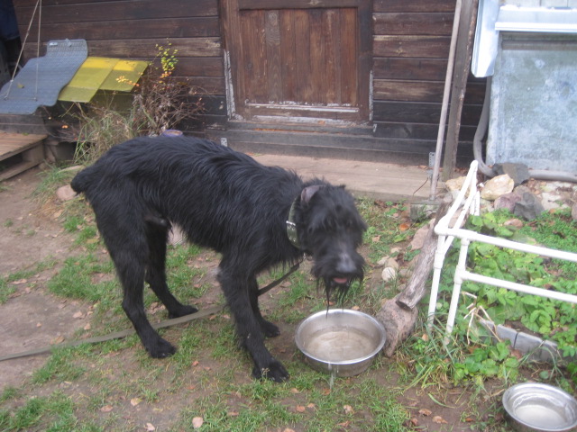 По совету Ирины Владимировны, знакомить стали не со всей стаей сразу , а по очереди))) Первым в очереди оказался Тёма. Мы прошлись кружочек по сопредельной территории и вернулись на наш участок. Лукаш особого интереса не проявил,но остался спокоен,а Тёма (!!!) предложил ему поиграть!!! Но ,увы,гостю сейчас не до игр(((( Он худ( Освенцим), очень высок,и пока,видимо, обеспокоен только -едой,водой и теплом... Попил,как Тёма-из всех мисок что были...Тёма ,кстати,был не против.....и всё могло бы получиться если бы....
