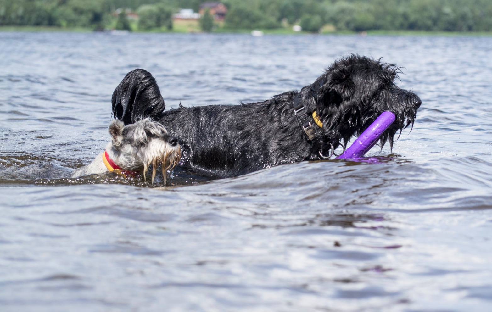 а за палкой я не плаваю - бросаю другую поближе к собаке - он переключается на нее.