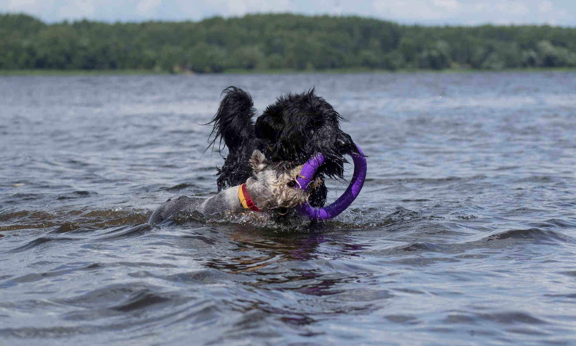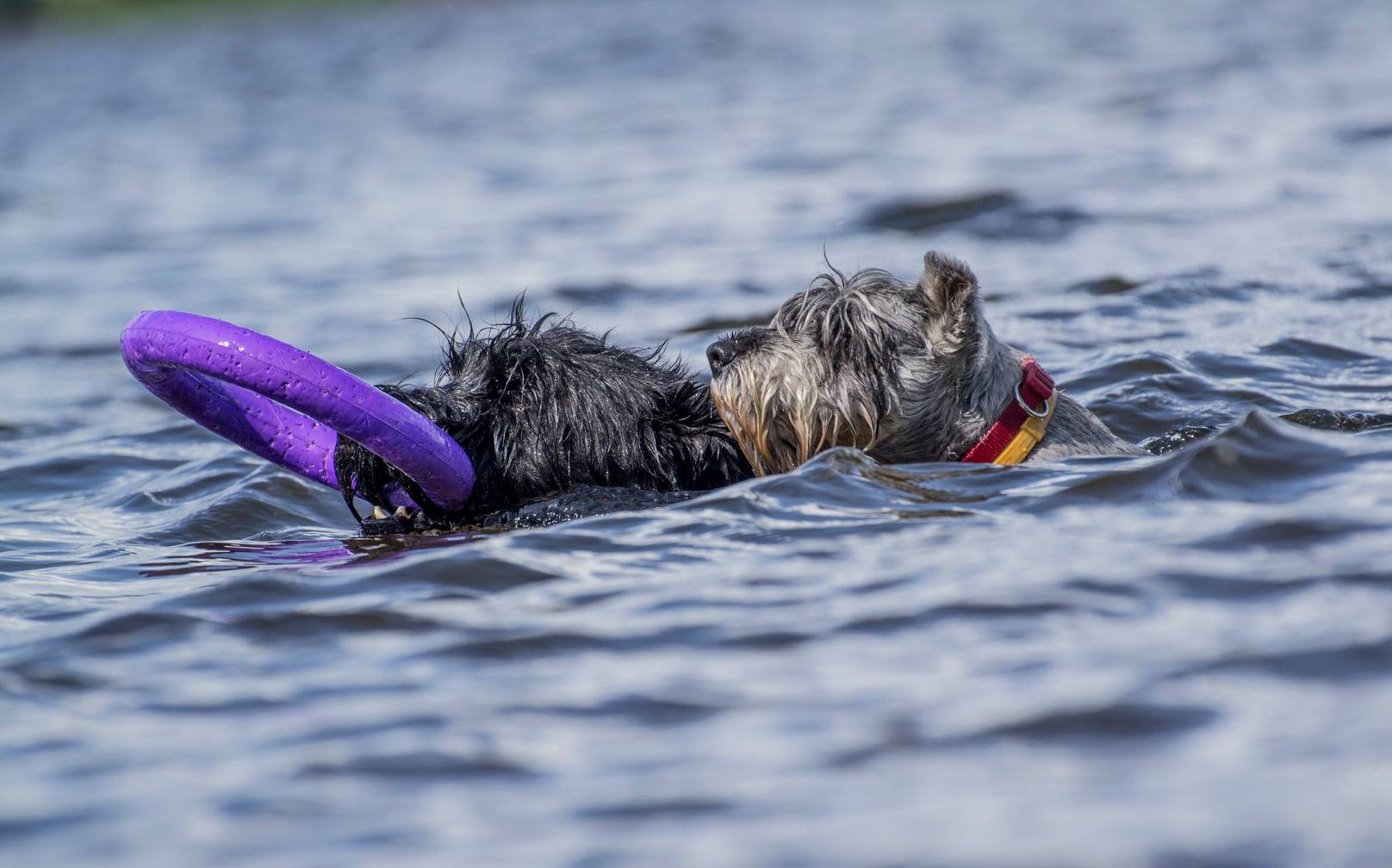 а за палкой я не плаваю - бросаю другую поближе к собаке - он переключается на нее.