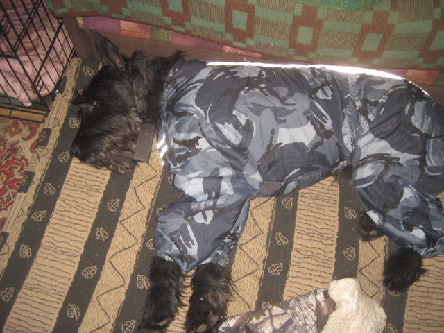 Флисовый комбез - сломали молнию. Но мерзнет уже явно меньше. Бегает в Темкином обмундировании.