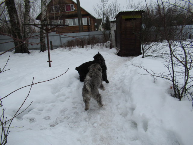 Утро.) Готовимся идти на прогулку. Хожу по участку- то птичек покормить, то снег на дорожку упал-убрать надо.... Данька носится по участку) (а у меня новенький фотик, и я как ребёнок таскаю любимую игруху везде с собой и играю-играю)))))И тут Данька несётся прямо на меня, с ходу садится в ногах и прячет морду мне в куртку..) Глажу по голове)) Данька высовывает морду, оглядывается и снова прячет морду ....не понимаю... оглядываюсь- рядом вьётся Шкипер ,раздувшийся и виляющий всем самим собой, как угорь ))))