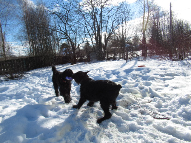 Утро.) Готовимся идти на прогулку. Хожу по участку- то птичек покормить, то снег на дорожку упал-убрать надо.... Данька носится по участку) (а у меня новенький фотик, и я как ребёнок таскаю любимую игруху везде с собой и играю-играю)))))И тут Данька несётся прямо на меня, с ходу садится в ногах и прячет морду мне в куртку..) Глажу по голове)) Данька высовывает морду, оглядывается и снова прячет морду ....не понимаю... оглядываюсь- рядом вьётся Шкипер ,раздувшийся и виляющий всем самим собой, как угорь ))))