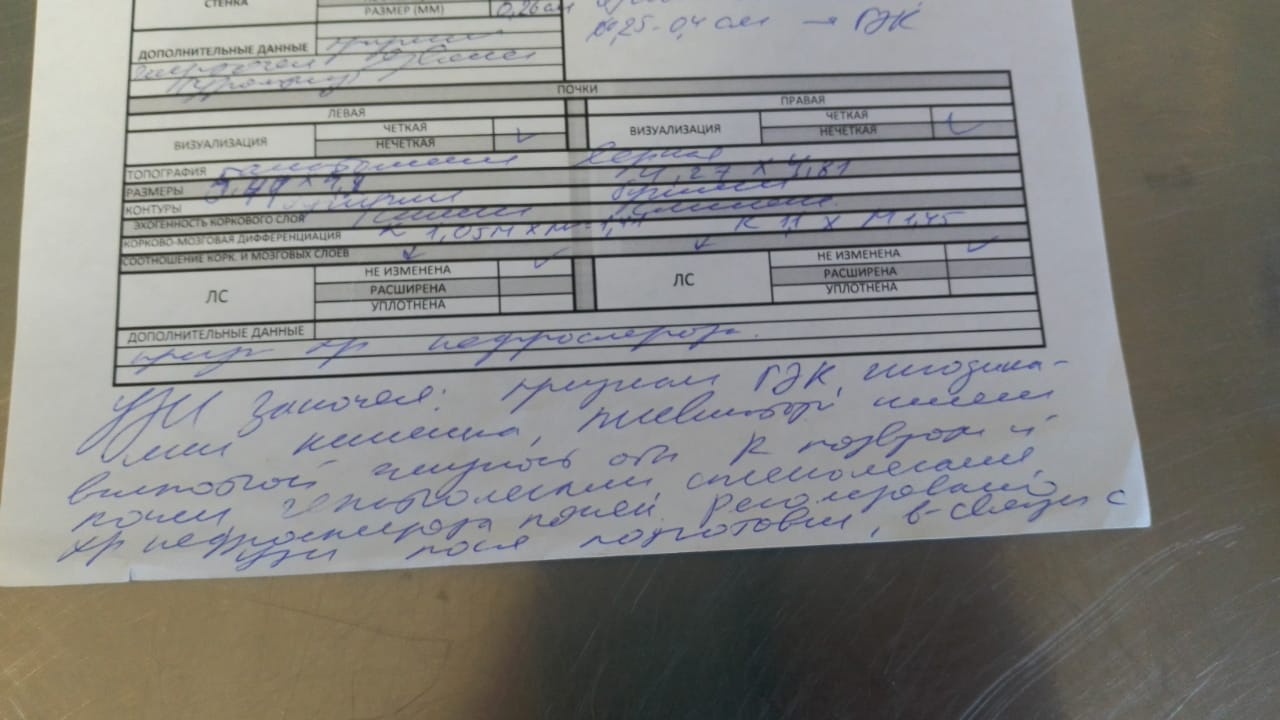 4. Почки нормально расположены, нормальных размеров, корковое вещество 6,64, кортико медулярная дифференциация сохранена, лоханка не расширена, не минирализована, конкрементов и очаговых образований нет.