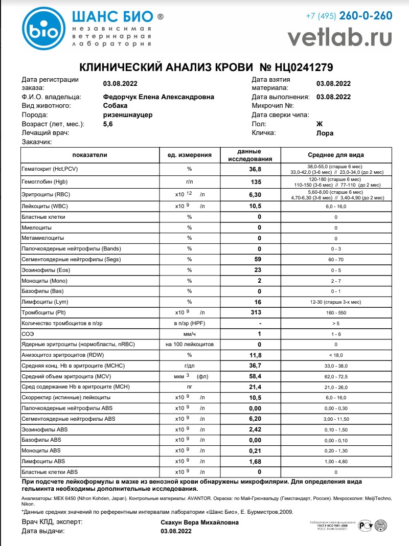 Ну и так как эозинрфилы высокие, то начало борьбы с дирофиляриозом можно начать и с диронета. Все как с уфимским