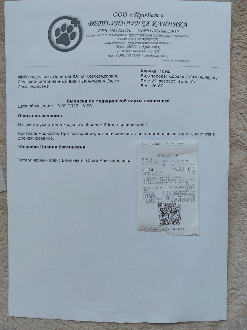Юля купила ему Римадил. Сьездили к врачу по проблеме цистит. Сегодня позвонила передержка , что раздулось ухо у него. Юля опять поехала, забрала его и к врачу. Юля пишет: