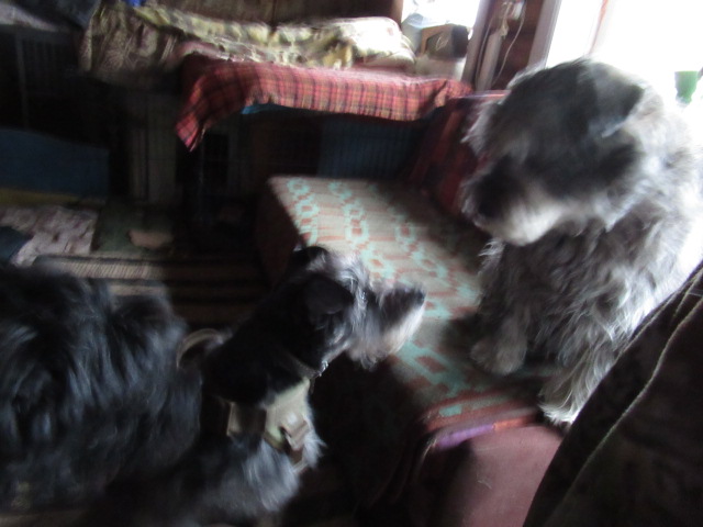 ...Собак погуляла, покормила , села позавтракать сама...(мои -то к столу не подходят) а Боня почуяв колбасу....Ааааа!!!! и ламбаду танцует, и сам себе подпевает, и задними лапами чечётку бьёт- из шкурки вон лезет....-и тут из своего угла, поднимается разъярённый гиппопотам и клацая и рыча прёт на Боню..., бедного, маленького Боню!! Натыкается правда гиппопотам на нас с веником.., и нехотя возвращается на место, но и Боня тут же телепортировался в свой угол.......
