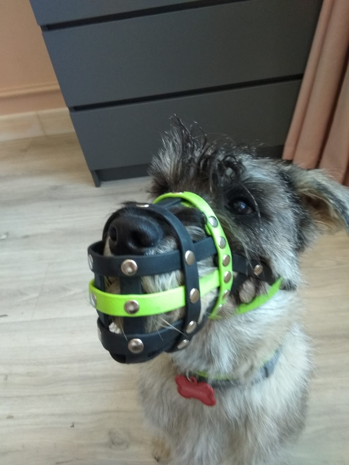 Отшили нам намордник, начинаем приучаться потихоньку. Сеня не особо в восторге и не понимает, что у этой женщины за новые выдумки, но т.к. из этой плетеной штуки кормят вкусняшками - готов поддержать это странное развлечение))