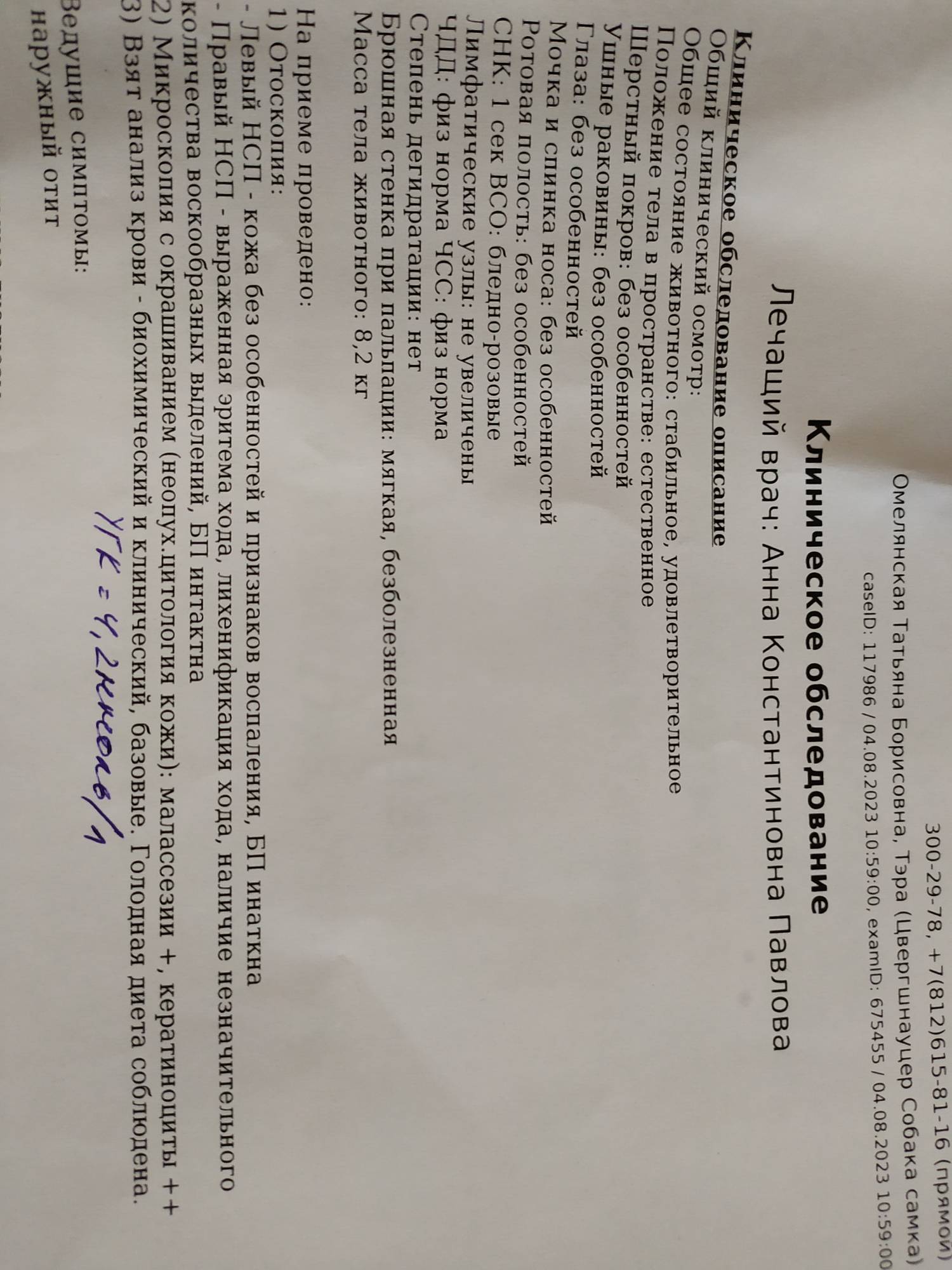 Спасибо, что приютили. От клеща надо обработать повторно 26.08., остальные назначения выполнены. кроме лапы мыть шампунем и уши протирать лосьоном.