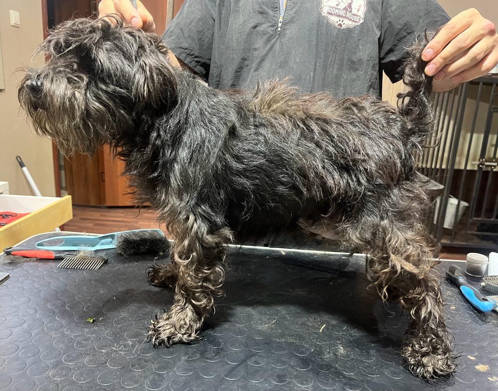 Сука черная. Клеймо не читается. Ошейник серый. Нет передних верхних зубов (резцов). Явно возрастная. Очень спокойная. Ей нужно быть около человека. Не активная. Тримминг. Юность хорошая. Отит левого уха. Сильный. Требуется лечение.