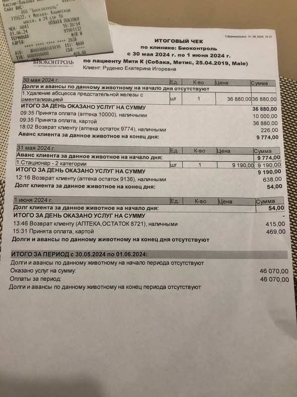 В Биоконтроле при оплате наличными дают скидку 5%, если полностью оплачивается чек. Можно с врачами ещё поговорить, на предмет того, что собака фондовская, а не хозяйская, может ещё скидку сделают.