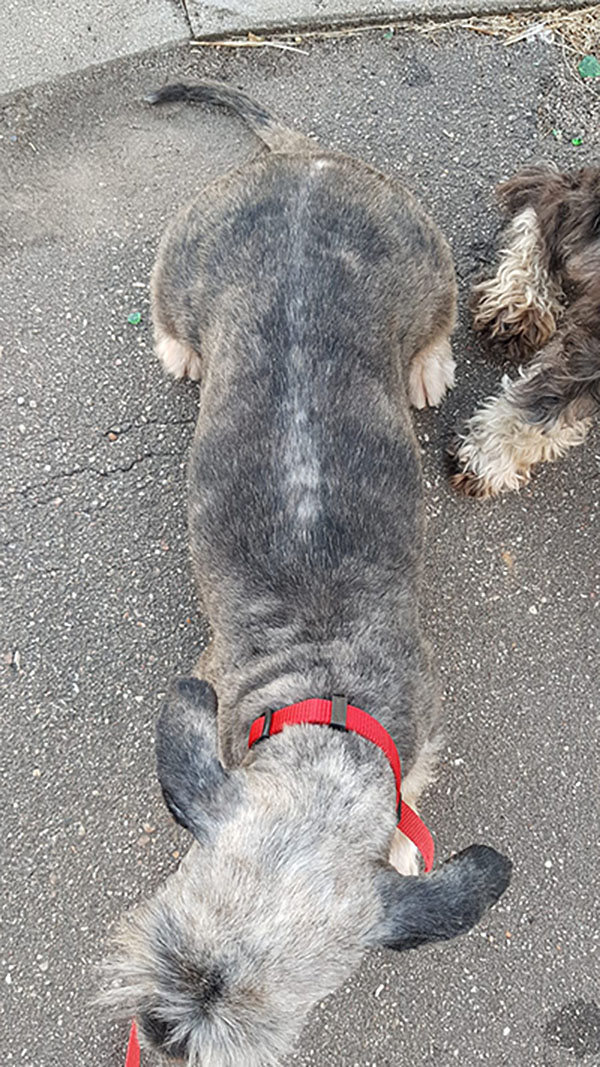 На спине след от сетки рабицы - дама пыталась слинять из приюта, но к ее счастью - не удалось.