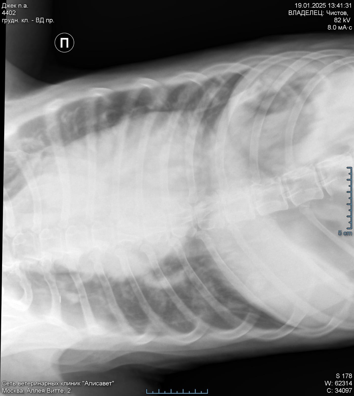 Желудок: полость незначительно расширена, наполнена жидкостным содерожимым и газом. Стенка до 3,8 мм, дифференциация слоев стенки сохранена. Перистальтика умеренная.