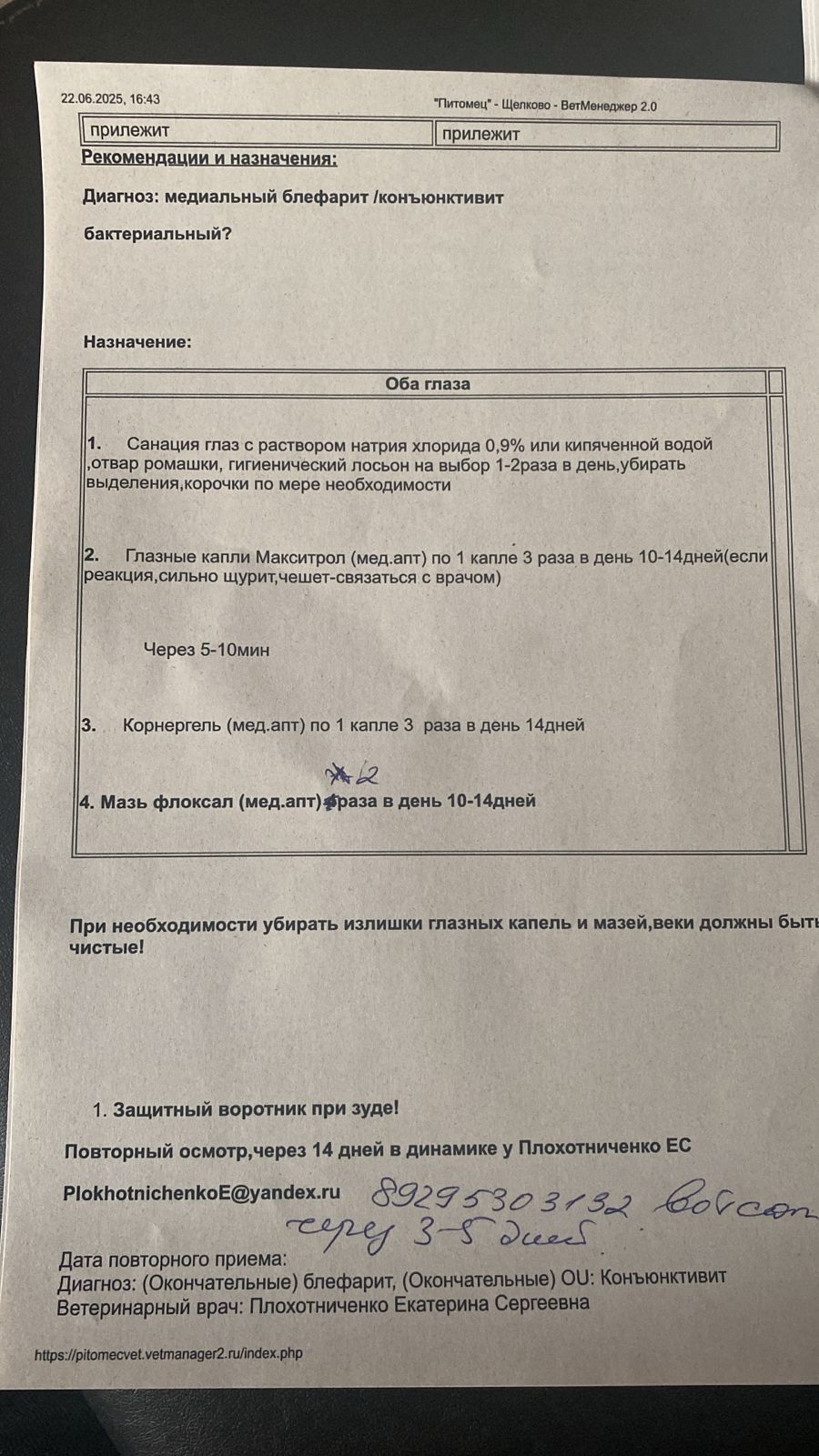 У Лели такое было - глаза гноятся, гной не промывают и он проедает кожу у глаз. Решилось дней за 10 - промывали чаем, за веко глазное желе, Актовегин вроде, язву сушили заживляющим гелем. И сейчас у нее бывают из глаз выделения - как пороет землю, надо мыть все и пару дней потом следить. Шерсть в местах, где были язвы более редкая, видно их до сих пор.friedlein писал(а): ↑22 май 2025, 00:11 От Кати: