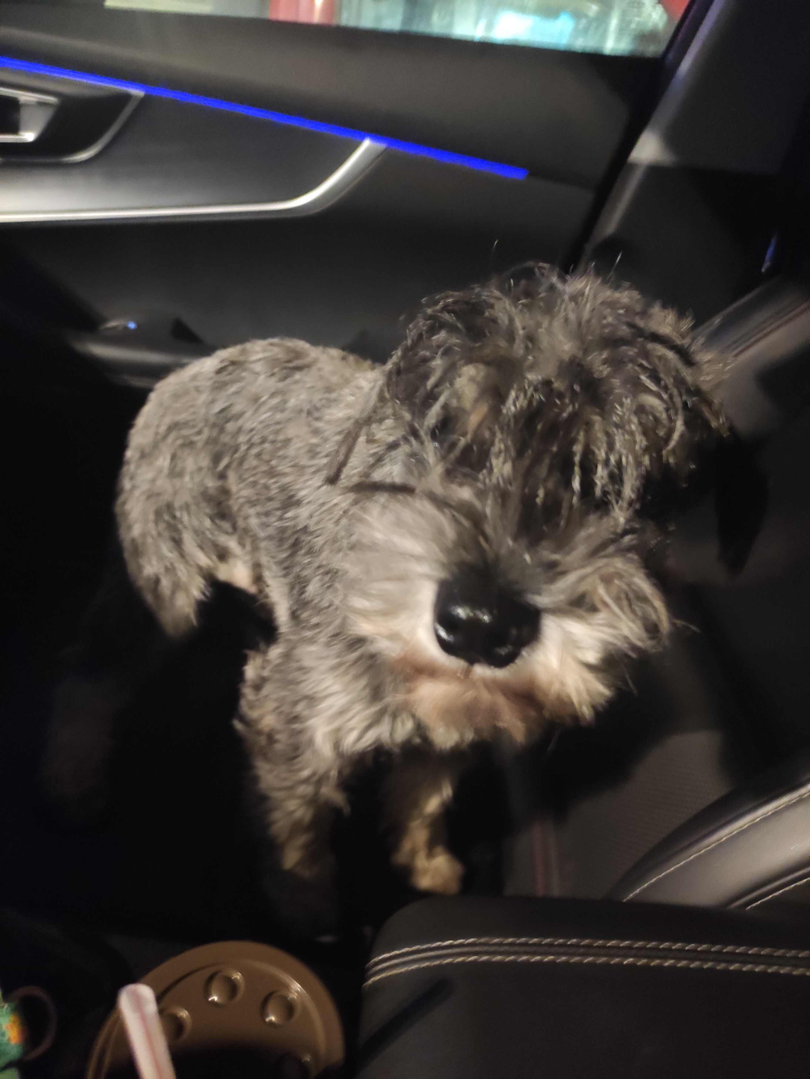Очевидна проблема входа в под'езд, лифт это для него ужас, пока все на ручках. На улице избегает контакта со всеми собаками. Не трусит, не прячется, но стоит в стороне и ждёт, когда пройдут. Надо время. Поводок - вперёд за Анфисой на пять. Поворот, разворот, возвращение к точке управления - проблема 😄. Но учится на ходу. Шнауцер.
