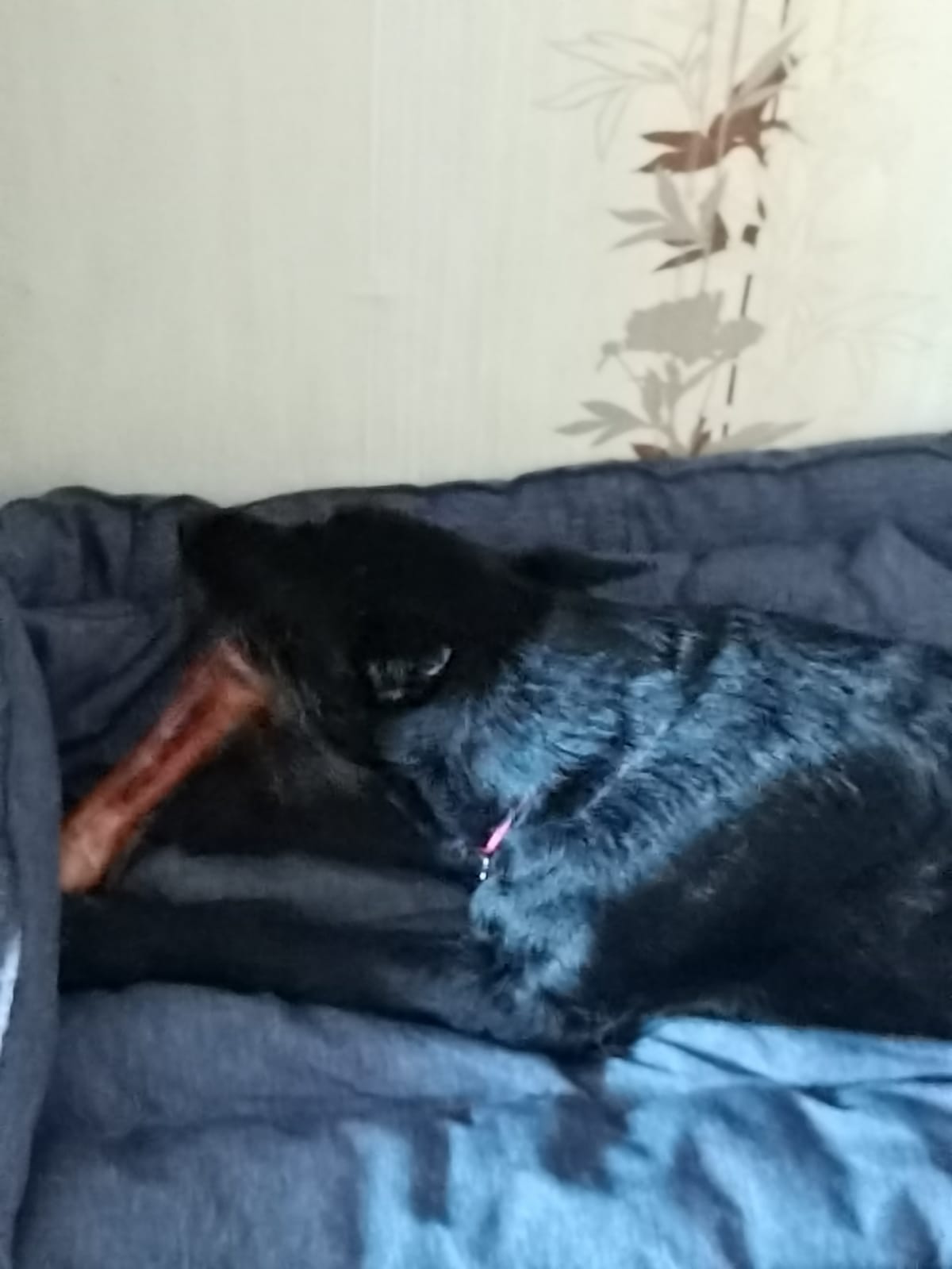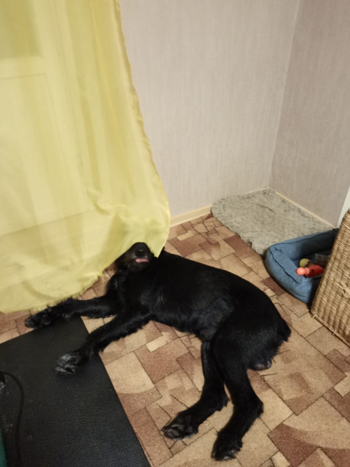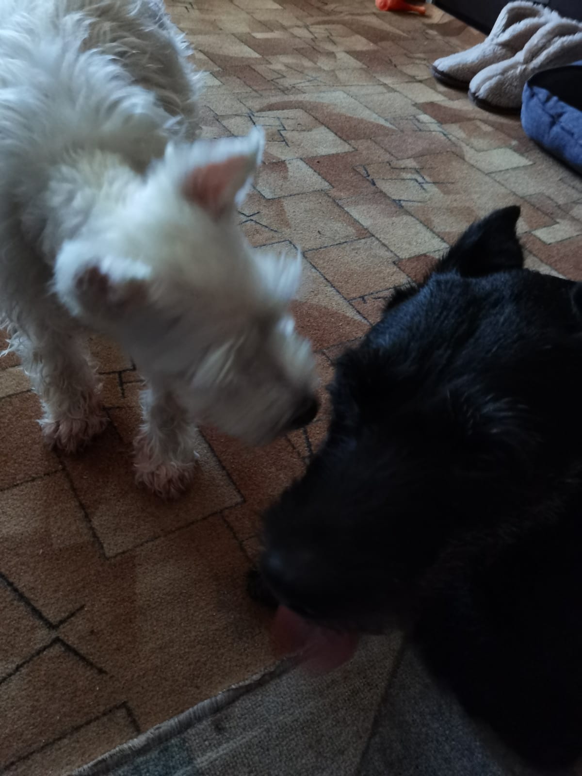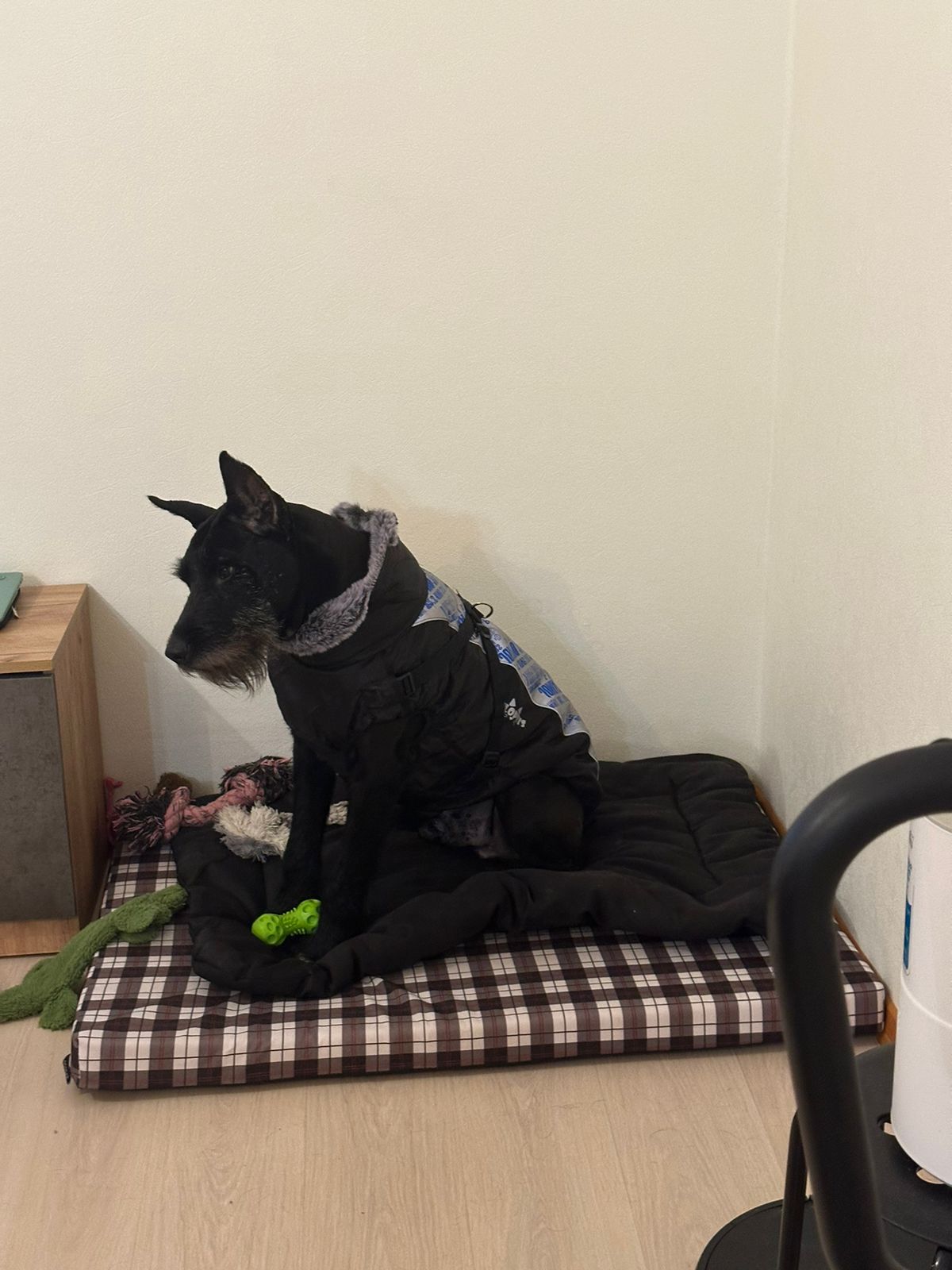 Погулял. Все дела сделал. Дома рстревожился. Бегал бегал из угла в угол. Ника была возмущена. Пыталась налаять. Но вроде утихомирились. Поел. Выбрал пока место сам. Хотя когда показали кровать понял сразу слово место и ложился туда.