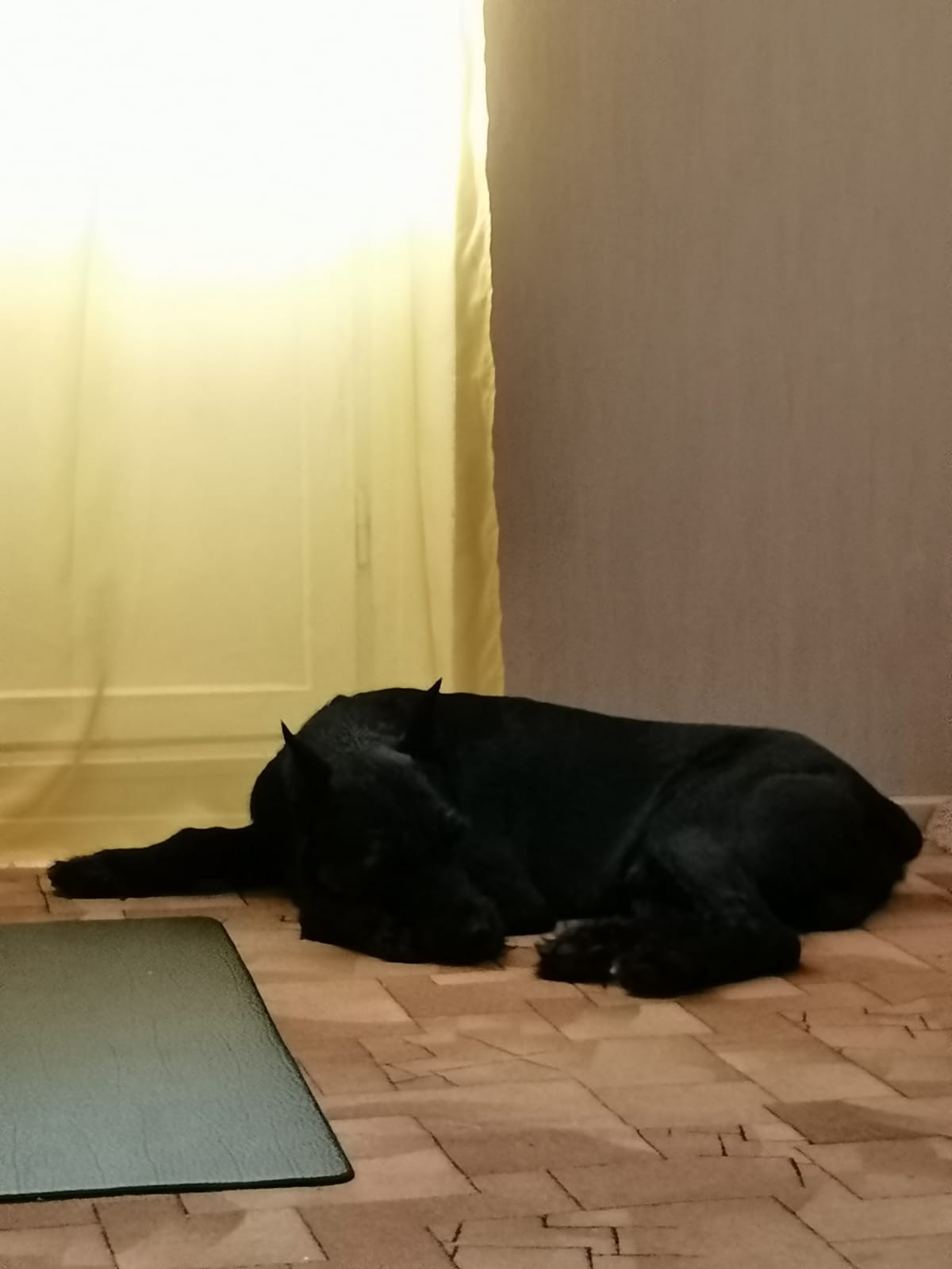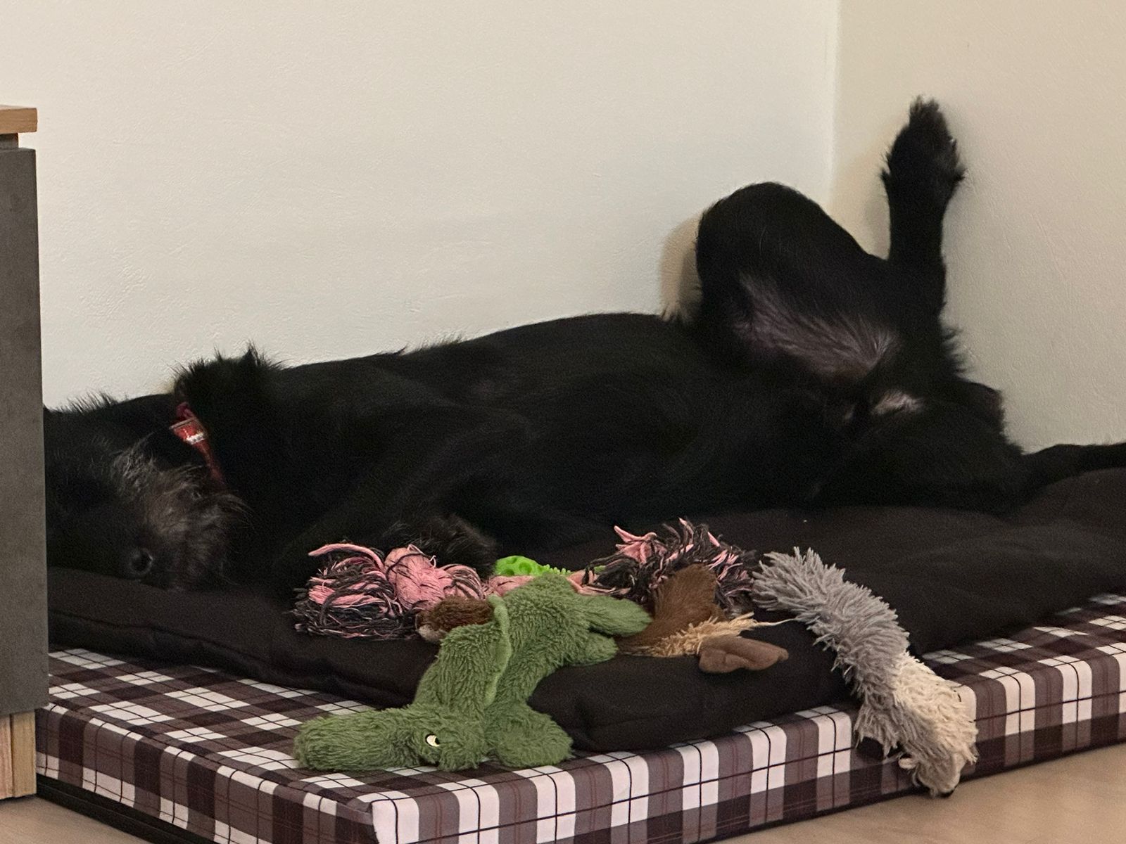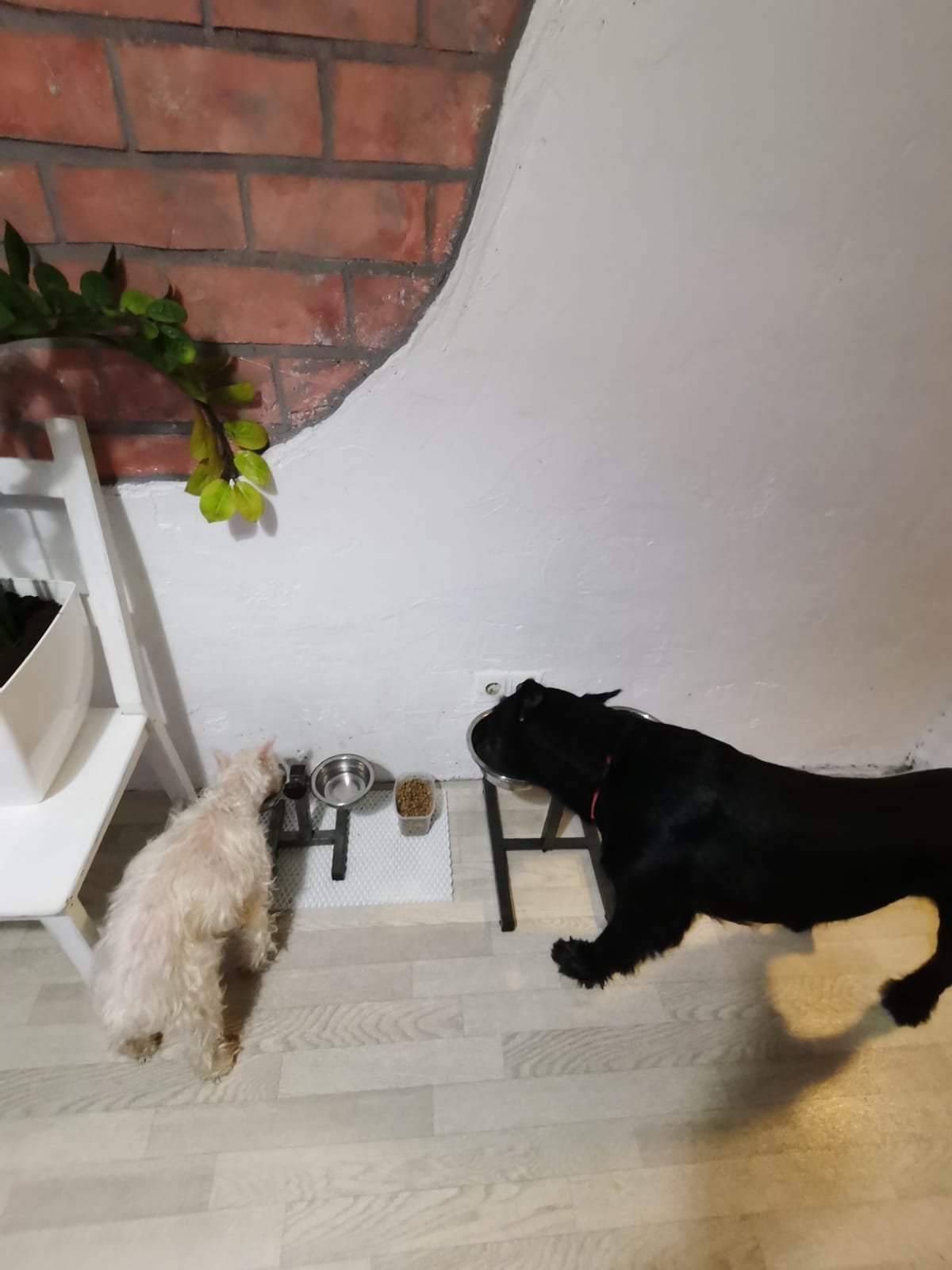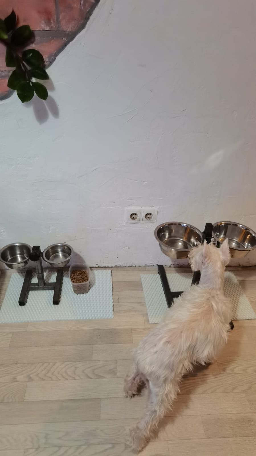 Погулял. Все дела сделал. Дома рстревожился. Бегал бегал из угла в угол. Ника была возмущена. Пыталась налаять. Но вроде утихомирились. Поел. Выбрал пока место сам. Хотя когда показали кровать понял сразу слово место и ложился туда.
