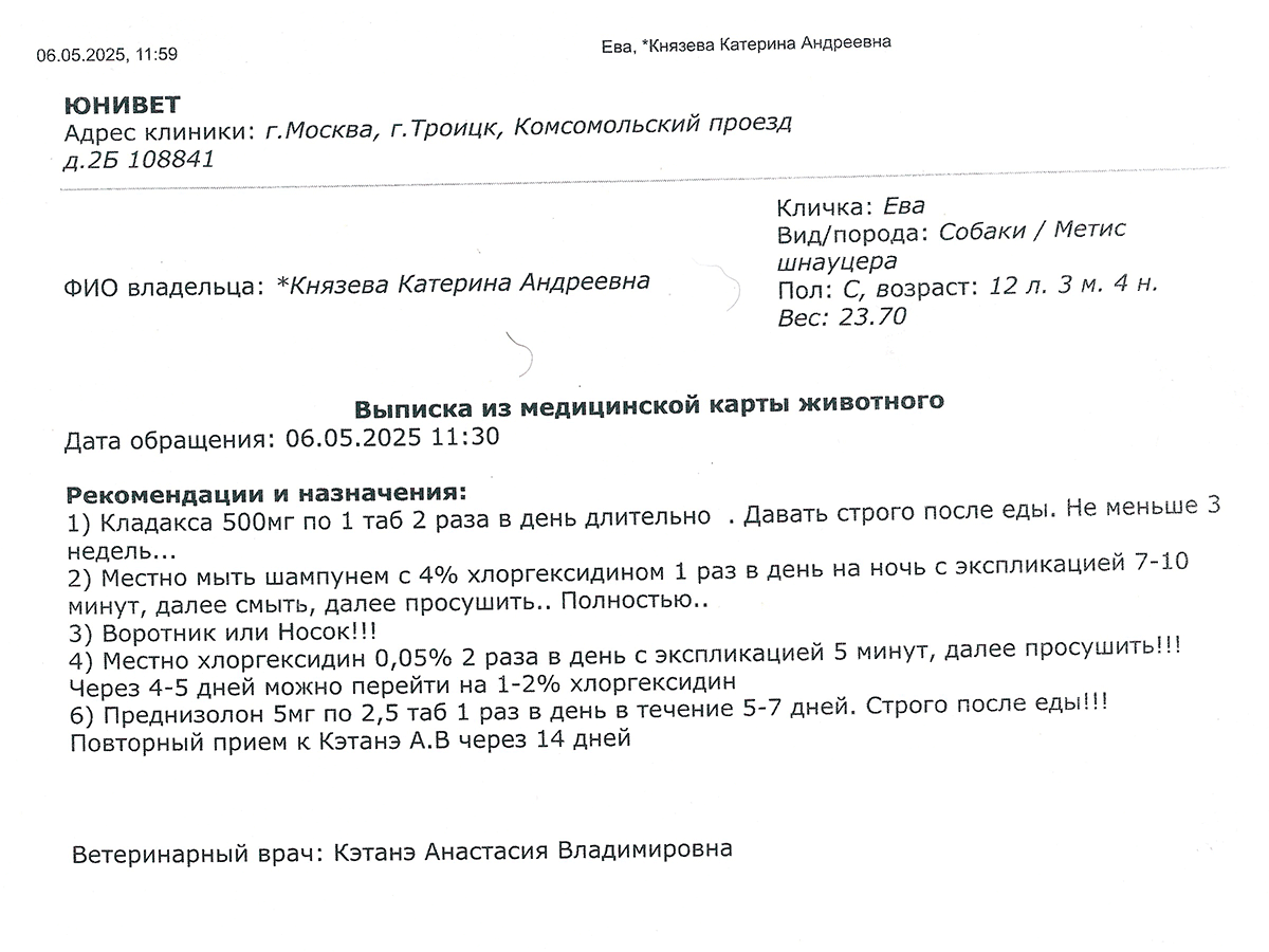 Но нужен повторный приём и поиск причин что она начала грызть лапу -- когда она разгрызла кожу, там завелось столько всякой гадости посторонней, что сейчас не поймёшь.