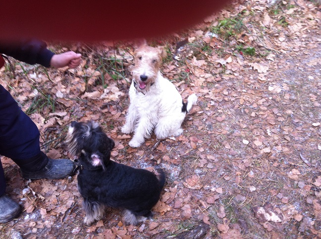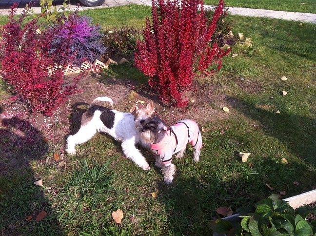 Пересылаю фотографии Моти-Плюши. Это она на даче с Ирсой (фоксихой наших детей и внуков). Мы опасались, как Плюша поладит с этой "безбашенной" девицей. Однако, наши опасения были напрасны. Плюша сразу показала свой шнауцериный характер, а Ирса оказалась очень понятливой. Два дня прошли в играх, совместном отдыхе и приеме пищи.