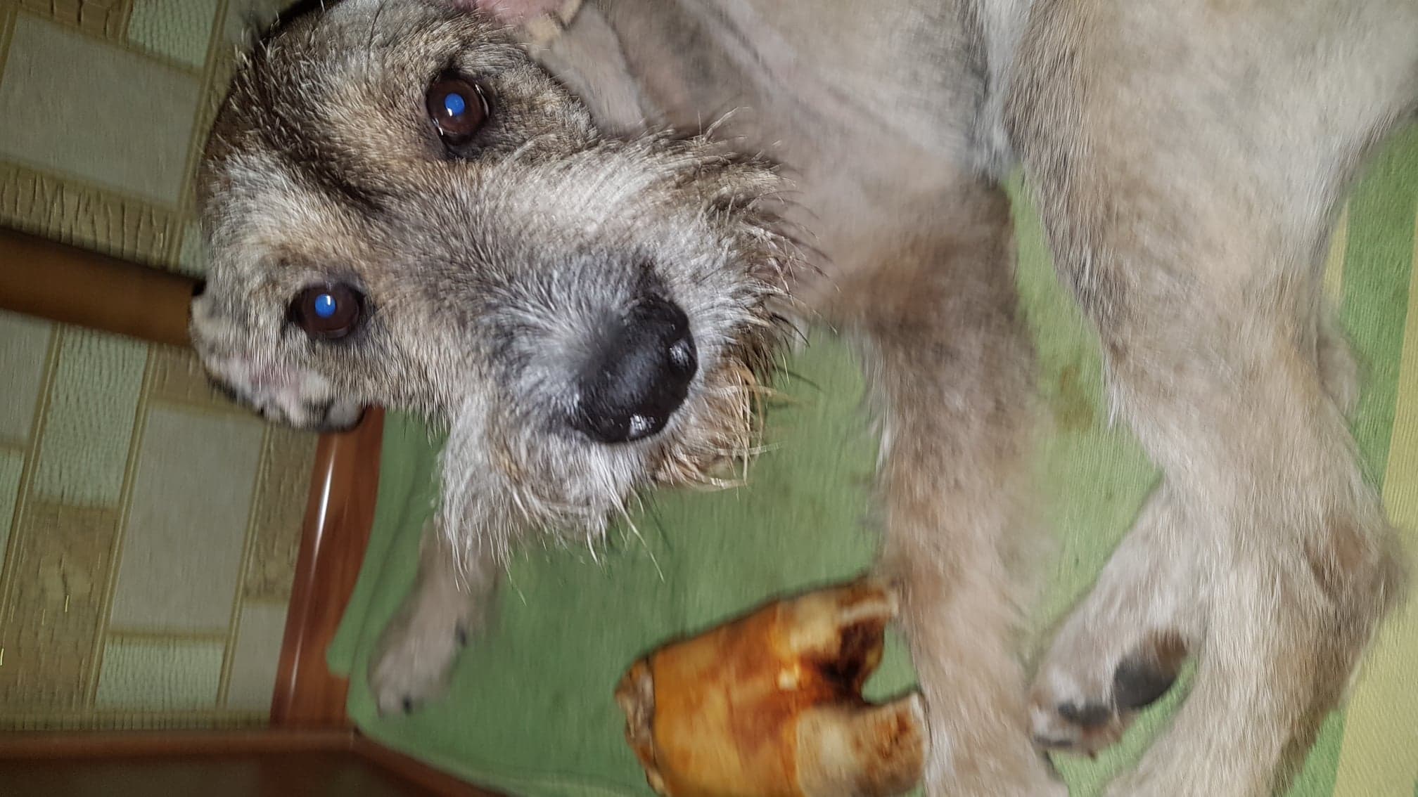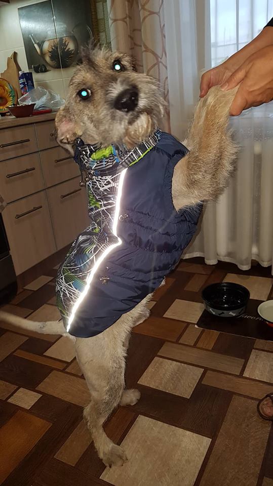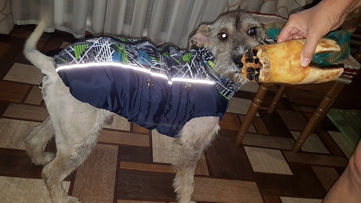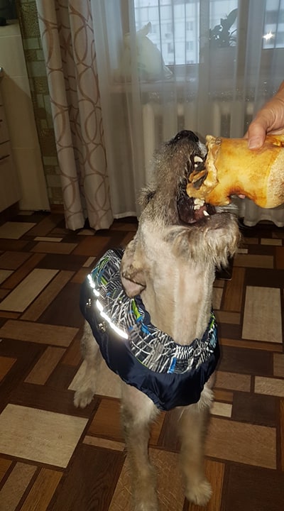 Мартин в новой жилетке и говяжьим копытом! Встретил радостно , быстро он освоился! Копытце привело его в щенячий восторг,даже порыкивал слегка,но без фанатизма,я его спокойно трогала когда он грыз.