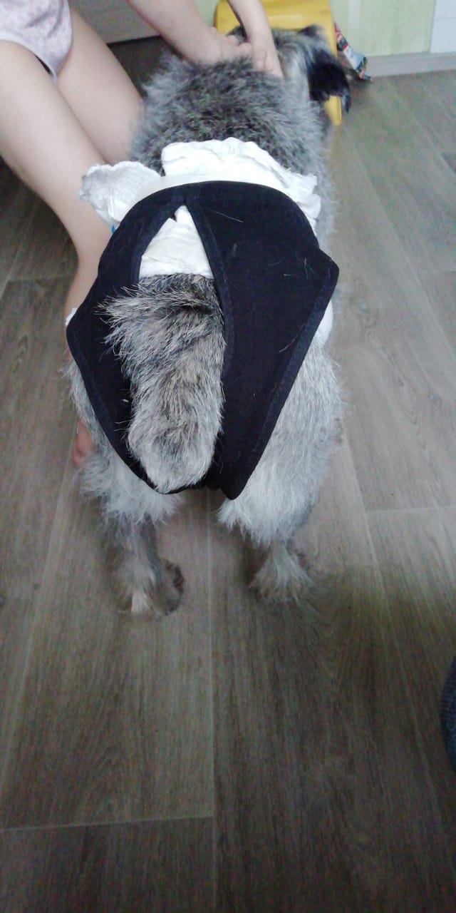 Привет от Чупика! Чупик потихоньку осваивается. Ночью идёт в комнату младшей дочери Кати смотрит на неё,когда она спит,и хвостиком влияет. Катя несколько раз ночью выводит его на попис,т.к.терпеть долго он не может. Одевали памперсы,но он их снимает. На фотке он прямо повеселел.