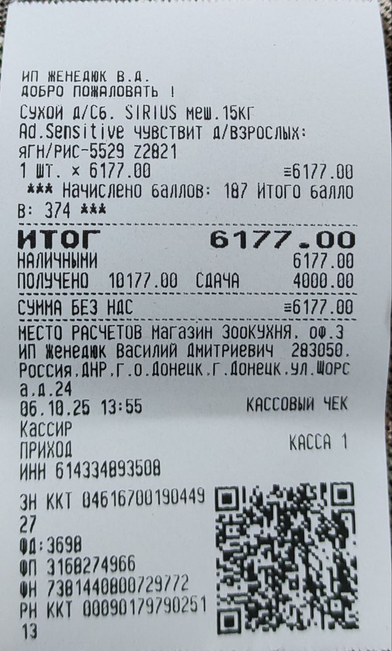 Расход: 12.08.25 покупка корма Бадику, корм Сириус 15 кг- 6177 рублей (чек общий, Оксана покупала для цверга своего корм, на сумму не смотреть, Оксана не догадалась товарный попросить.)