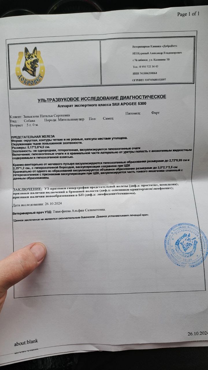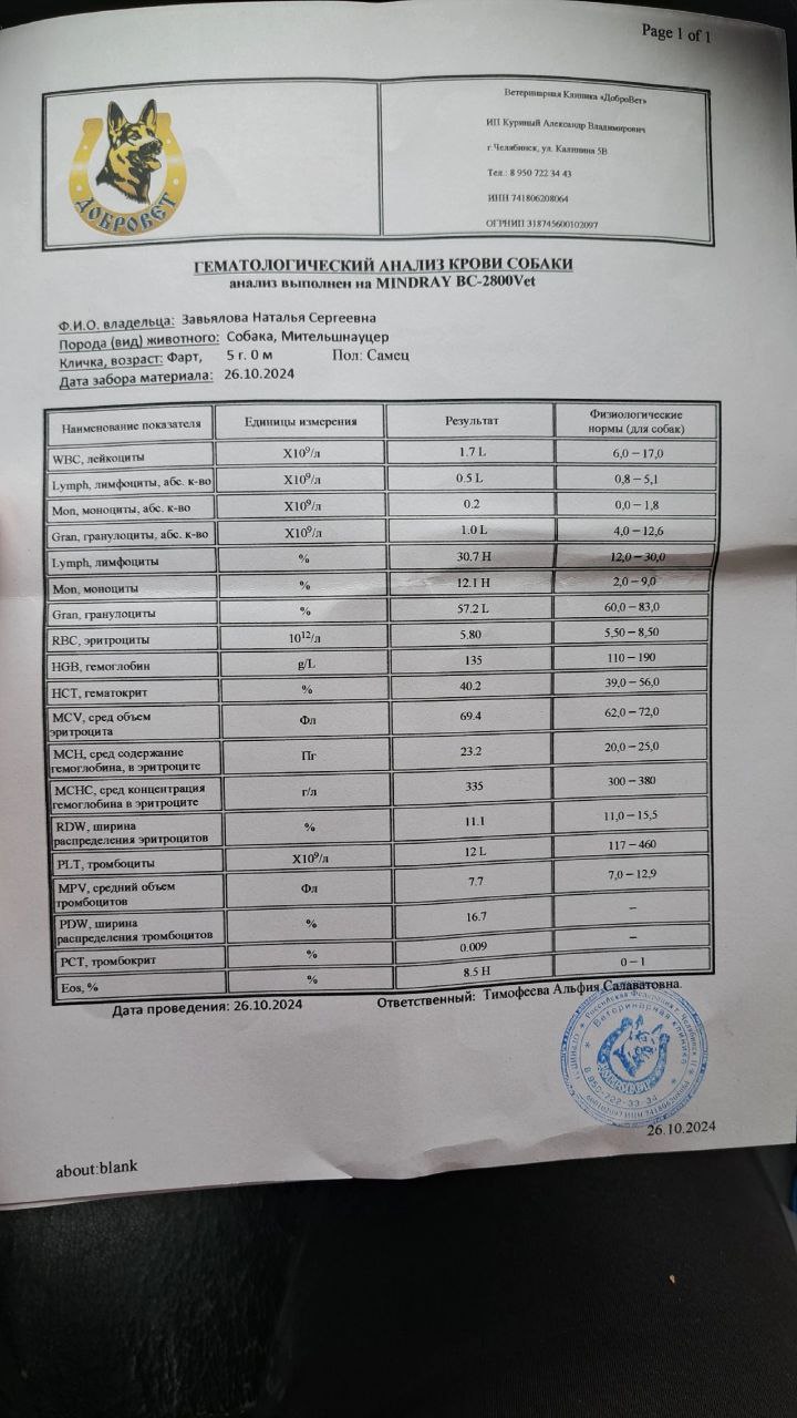 Заводчик готова его забрать в выходные, но я реально понимаю, что она не сможет лечить такую тяжелую собаку. Она живет за городом, плюс много животных, одна из них старая ризинка с приступами, плюс лежачая мама, нет машины и работает с утра до вечера на пятидневке. Думаю, мы сможем лучше обеспечить его лечением, по крайней мере, пока. Ему же надо динамику по крови смотреть, лечение корректировать. Я прекрасно понимаю что заводчик сделать это не сможет. Так же откликнулась хозяйка его отца, они своим питомником собрали на него значительную сумму, 31 тыс. Плюс еще шнауцеристы помогают. Так что пока на его счету денег достаточно.