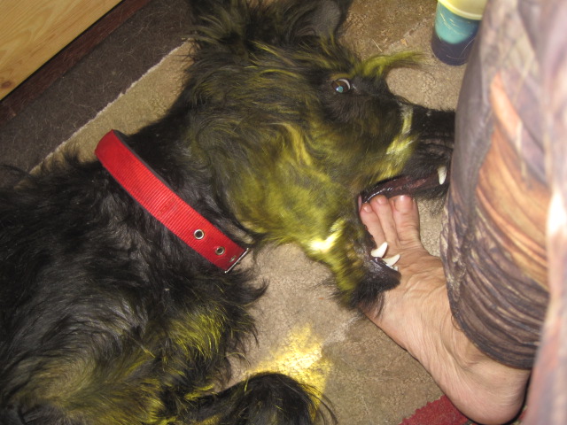 Обрабатывать уши ,лапы и всю остальную собаку даёт спокойно, стал спокойнее давать трогать морду и смотреть зубы...