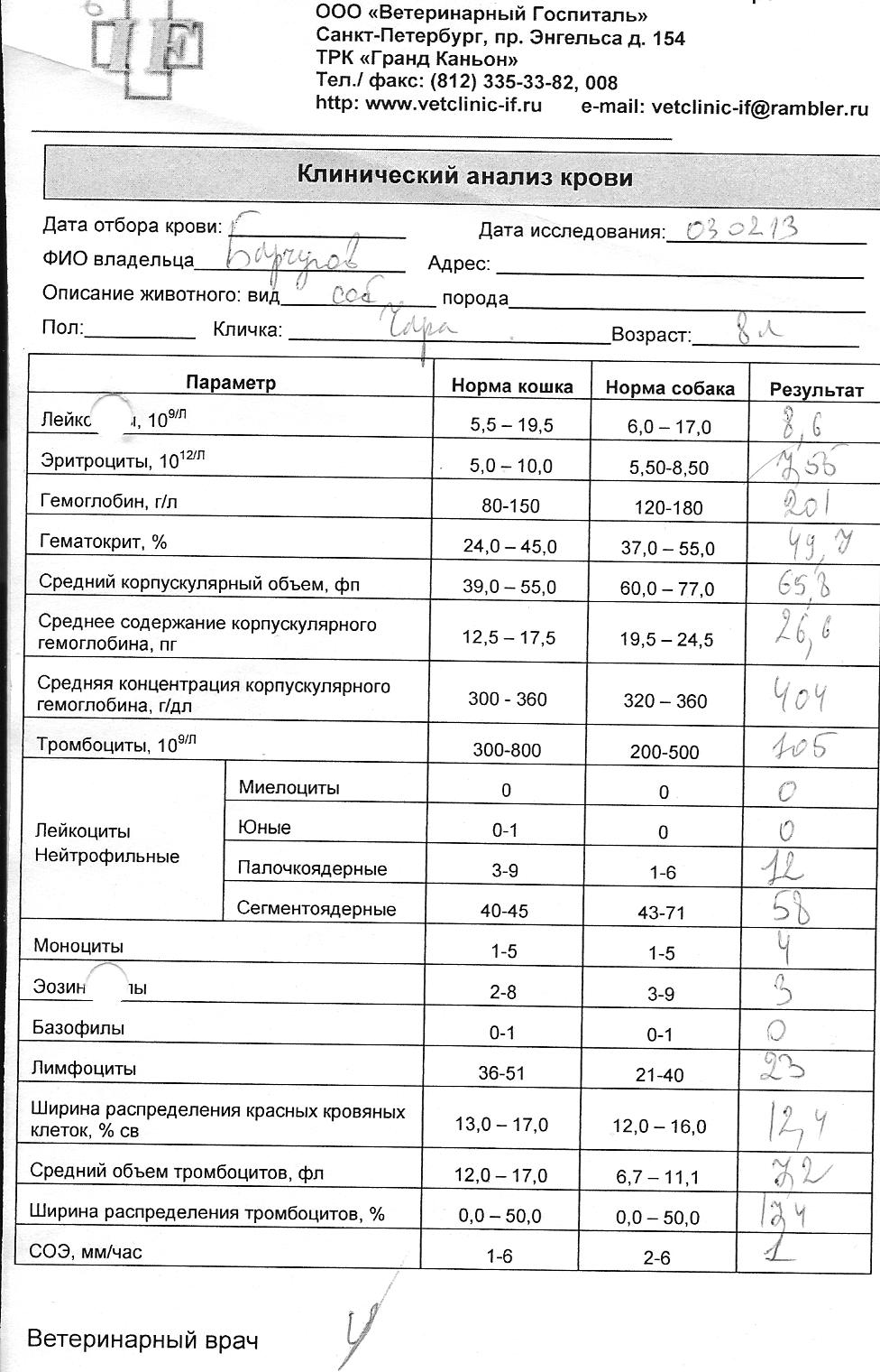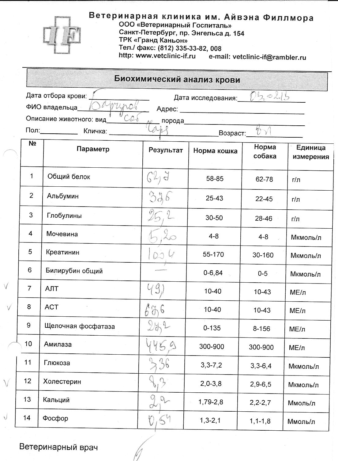 Здравствуйте, форумчане. А не могли бы вы прокоментировать Чарины анализы. В последнее время Чара стала уставать на прогулке, дома больше лежит с грустным видом. Возможно это просто возраст (8-9лет), да и растолстела немного (теперь пайку уменьшили), возможно суставы дают о себе знать (в последнее время больших проблем небыло, но задние лапы все же периодически поджимает). Пока сдали кровь клиническую и биохимию. Вижу, что есть отклонения от нормы. О чем они могут говорить? Буду благодарна за объяснение. Результаты анализов выше уже выложила.