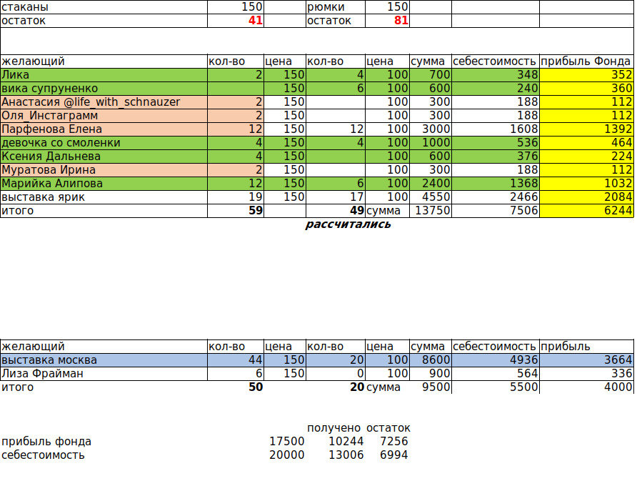 Получено от Аси 850, от Татьяны Madeleine 1000, Anett17 500, Nastas’ya 1130, перевод от dar 1500, итого 4980. Заказаны 22 белых и 4 красных кружки. У меня 2+2 лежат для Anett17 и Madeleine, пока без оплаты. Пока не знаю, как передать, в Москве больше не появлюсь. Все остальные кружки у Оли, деньги за них вносятся, я так понимаю, по факту реализации. Остаток кружек Оля озвучит.
