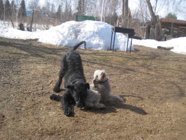 И вот на таком то снегу и затеял молодой О.Тяпка тренировку «Сбей противника с ног»! И выбрал напарника себе, не юркого М.Атаку, а мощного сурового (С.Капкана ) Генку и так проваливающегося на каждом втором шагу)))) И Разбег….. разбег, если это можно назвать разбегом, с О.Тяпкиной правой задней ,без когтей, она при беге по льду . больше похожа на второй хвост…И О.Тяпка, уже не очень похожий ,со стороны на собаку, въезжает в ничего не подозревающего Генку… Влажный «чвах», Генкино –«Брааааа» и оба по пояс в сугробе. У Генки из сугроба торчи голова и передние лапы… а ,ла, ещё вытаращенные, возмущенные глаза, а от виновника «торжества» -попа, хвост и задние лапы…..Сугроб оказался не сугробом , а низинкой под берегом , и по пояс там было мне)) а собакам….. при малейшем их движении , при попытке выбраться, как в фильмах ужасов они погружались всё глубже!!!! Слава богу под сугробом был берег а не вода!!!!!Сначала , набрав полные сапоги снега, вытащила Генку, а уже потом , под Генкин мат , и настоятельные Генкины просьбы оставить паршивца в сугробе, несчастного О.Тяпку…Прогулка удалась!!- мы с Генкой – мокрые и сердитые, О.Тяпка мокрый и задумчивый, а М.Атака и Мухтар Бубурович- счастливые и очень довольные представлением.!!)))