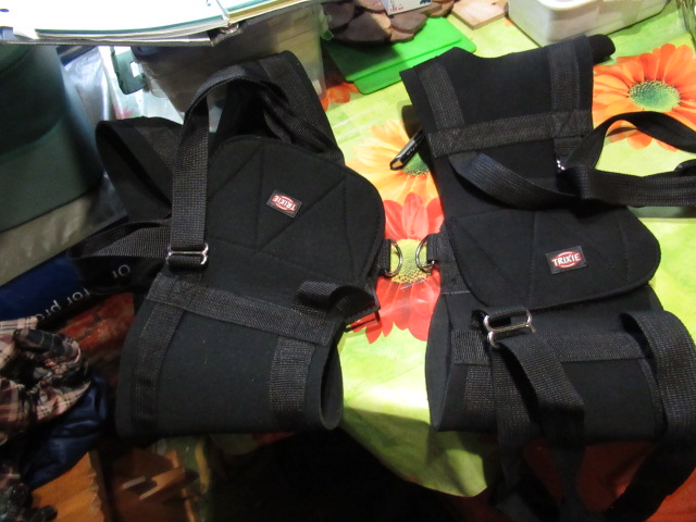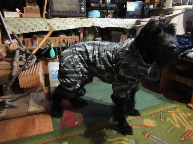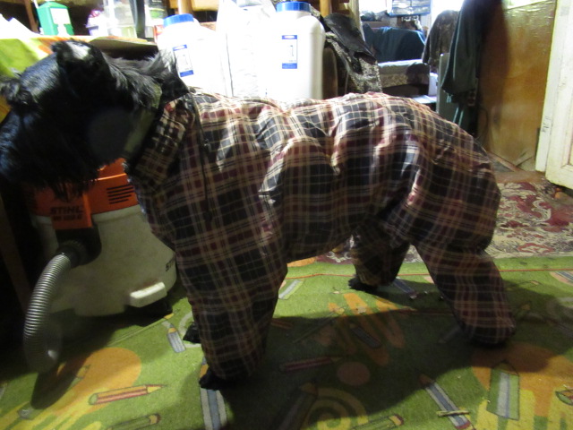 Из трёх комбезов один подошёл благодаря огромному количеству утяжек во всех мыслимых и немыслимых местах)) Так что теперь мороз Нику совсем не страшен!!))Вот эти два комбеза-хороши, но Нику велики(( и если передняя часть хоть как-то держится на нём, то задняя сваливается и мешает ходить(( а вот этот )) оказалось возможным утянуть ( даже под хвостиком есть утяжка!!) так что Ник может в нём не только красиво стоять, но и ходить!!!