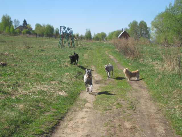 А как ненавязчиво стая обучает …Тёма хорошо ходит «рядом» ,возможно потому, что «рядом» хорошо ходит стая? И даже такие упражнения как- команда рядом- шаг вперёд, рядом- шаг в сторону, рядом- шаг назад….. правда выполняя это упражнение со всей стаей . мы больше похожи на стаю скворцов, чем на отдрессированных служебных псов)))) Но направление меняется верно, и стая не распадается, все держатся «у ноги»,в меру возможностей конечно. Нет , когда мы с Тёмой один на один- там всё понятно , … хотя не всегда просто…))) Дрессура очень напоминает торговлю, обмен – ты мне барьер возьмёшь. Я тебе печеньку дам… А стая??? Ведь никто никому печеньки не даёт, не ругает и не хвалит…стая просто что-то делает, или чего-то не делает… А когда все вместе…интересно ..он слушает стаю или меня…??? Ложиться, брать барьеры, ходить по буму , команда «домой», команда «со мной» ,и не только это , стая по клумбам-грядкам не ходит..и Тёма тоже….. Тут как-то , на чужом огороде (соседском)) убежал подальше, а мы (неожиданно))) домой повернули, между нами оказались грядки…Тёма рванул за стаей…по междугрядью!!!, а потом огромным прыжком наискосок …ни одной лапочкой на грядку не наступил……. и всё это без лакомств, поощрений , наказаний легко и практически без моего участия…..с похвалой, конечно словесной))) но не более…