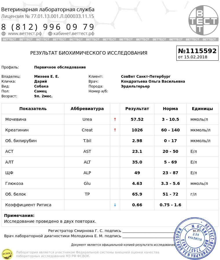 Здравствуйте! Очень нужна помощь в расшифровке анализов. У очень хороших знакомых заболел эрдель. Сначала появился кашель. У нас толком никто диагноз поставить не может. Кроме, как проблемы с сердцем, нигде ничего не сказали. По рекомендации нашей Иры Озеро ребята съездили к Герке. Там узи, рентген. Диагноз эндокардит. Выписали антибиотик в таблетках. Название не скажу сейчас. Уточню позже. Собака отказывается от пищи и почти не пьет. 3 дня не ест, если ест, то тут же тошнит. Скинул уже 2 или 3 кг. Ощущение, что после назначений собаке стало хуже, чем до лечения. Пришел анализ крови. Говорят, что процесс с сердца пошел на почки. Собаку "кормят" через капельницу. Хозяева в панике. Лечение есть, а собаке всё хуже. Может индивидуальная непереносимость конкретного антибиотика? Заранее спасибо.