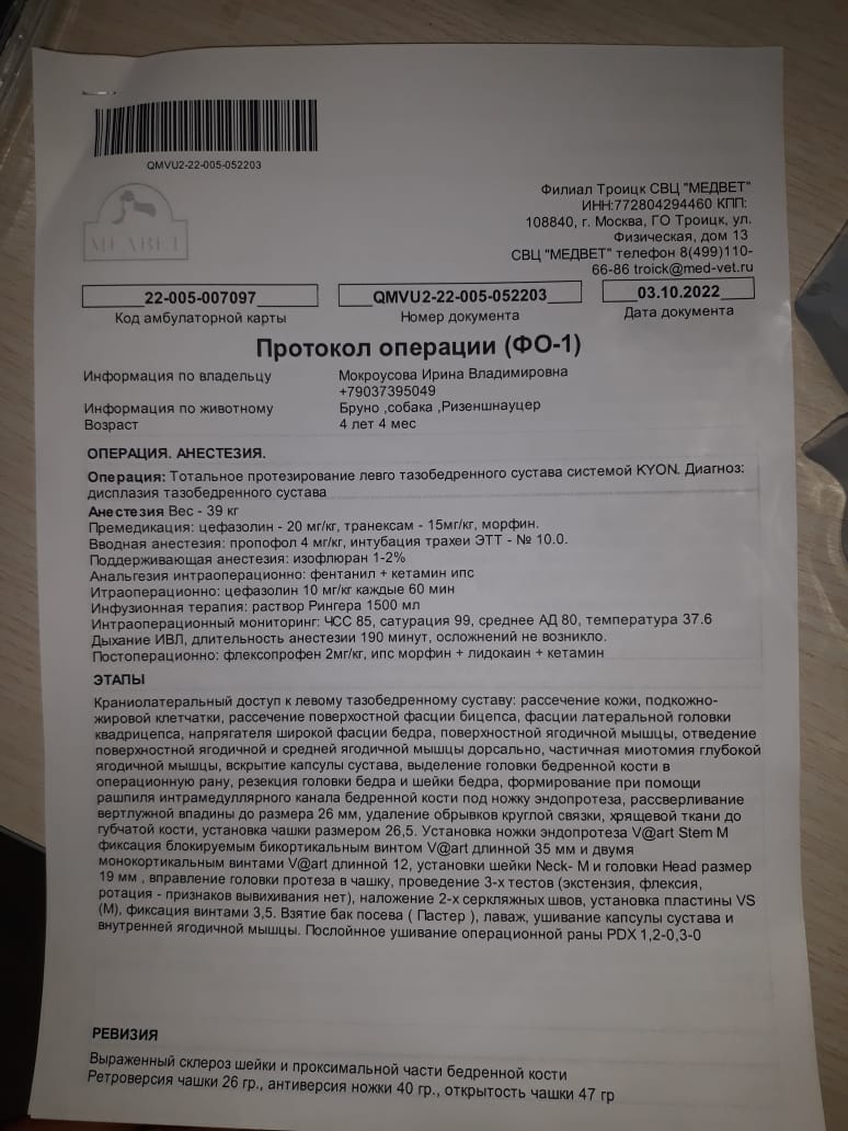 Съездили мы с Бруно к врачу. Скажу честно, и врач очень расстроился, увидев состояние шва, и мы с Ирой вслед за врачом. Илья Федорович очень опасался, что свищ дошел до сустава, а это самое плохое осложнение, которое можно себе представить. Забрали Бруняшу, сделали наркоз, рентген под наркозом, всё вычистили, наложили швы. По словам хирурга, внешне пока до сустава не дошло, воспалительный процесс, вызванный разлизанным швом и попаданием туда инфекции, затронул только мягкие ткани. Но бакпосев взяли. Будет готов через 5-10 дней. Ждем и надеемся. А пока продолжаем пить антибиотики, обрабатывать дренаж, который вставили в шов во время операции сегодня, беречь шов как зеницу ока.