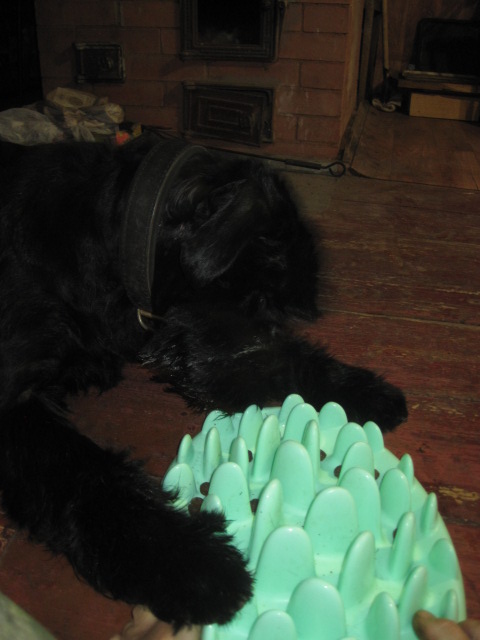 Сказано-сделано, вечерняя еда разложена была по железным мискам, и роздана в обычном порядке...О.Тяпка не сразу сообразил , что это старая миска...разлёгся возле неё и приготовился ЕСТЬ ДОЛГО...да не тут то было, еда кончилась ...ОЧЕНЬ быстро кончилась....(хотя мне показалось, что Тёма ел медленнее чем раньше...и дочке так показалось..)