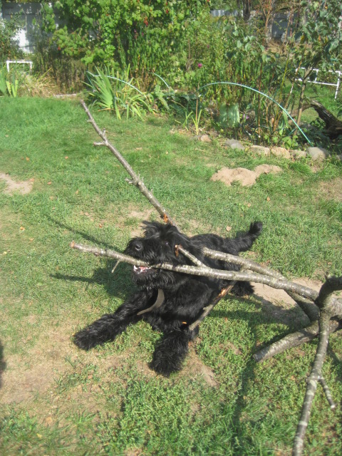 Гуляем мы как-то по любимому соседскому участку, мы с Валюшкой-соседкой о своём о девичьем....-она про огород, )) я про собак))-душа в душу-беседуем. Мальчишки делами заняты- Мух степенно сам себя любимого выгуливает, Генка ищет чего бы схавать голодной собаченьке (а соседей-то приучили)))на участке НИЧЕГО криминального)))), и так он занят , мордой в землю и не слышит ничего и не видит....не видит что два обормота бегалки на скорость и ловкость затеяли..... а надо сказать что соседи небольшую стройку затеяли и по всему участку -доски - брёвна в живописном беспорядке разложены.... почти дрес площадка)))...И Шкипер с Тяпкой как раз беготню с прыжками и подскоками и начали))) Разбегаются и до конца участка- РРРРаф-и в обратную сторону, РРРРаф-и ещё....и ещё, а потом решили по полному кругу бегать...Несутся.....у Шкипера центр смещён он разворачивается мгновенно-раз и обошёл Мухтара ... а Тяпке перепрыгивать пришлось.....
