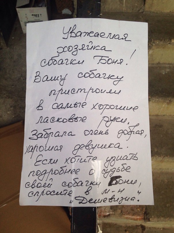Собаку Боню забрала женщина средних лет. Местные говорят, что очень добрая. Если будут проблемы, попросила мне сообщить.