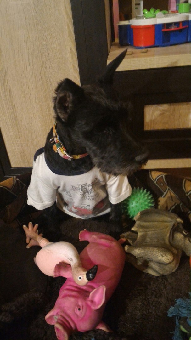 В остальном проблем нет: собака активная, контактная с другими животными, любит играть в игрушки, особенно в мячики - обкладывается ими в лежанке, как курочка на яйцах.)
