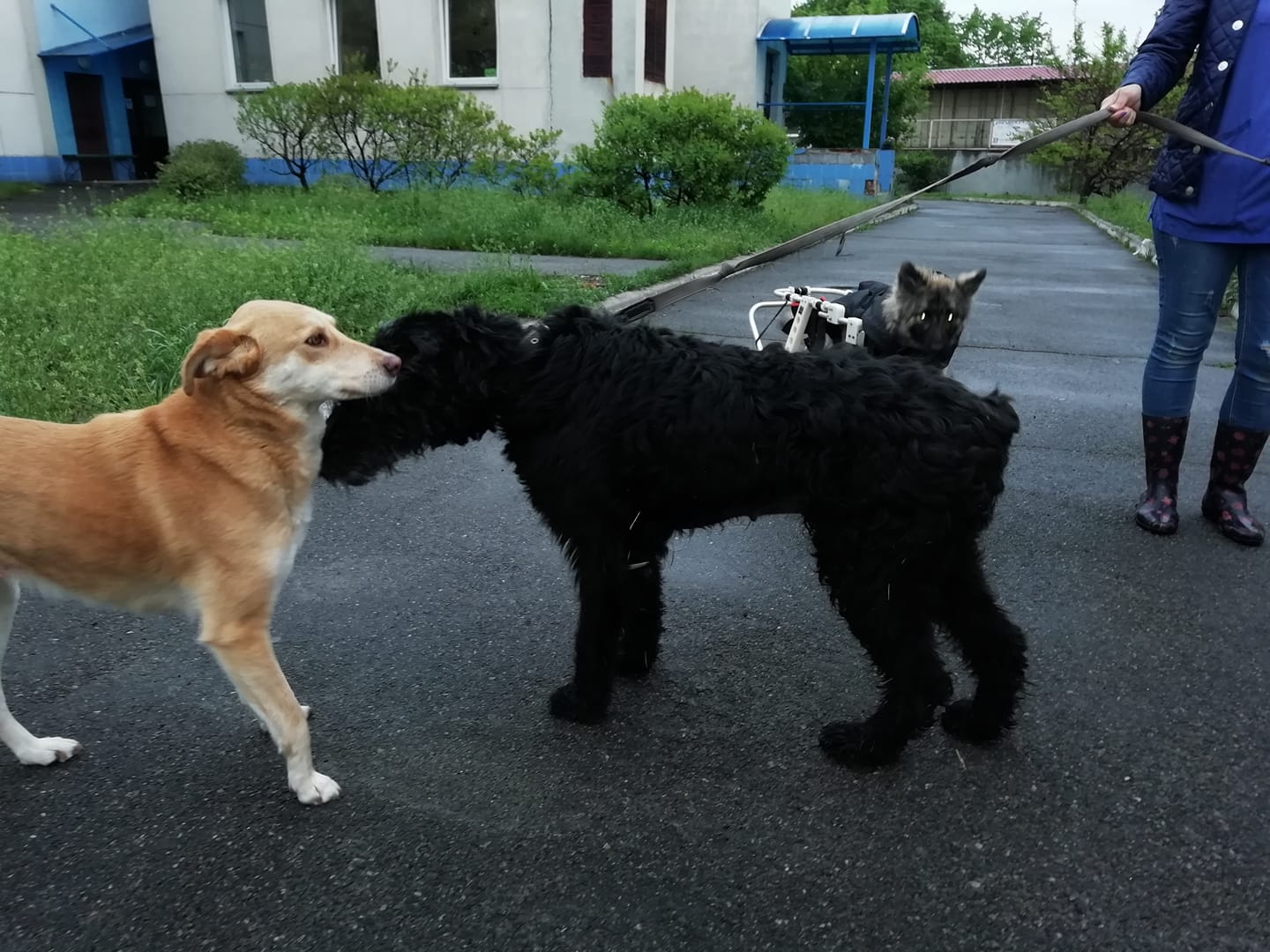 ходит бодрячком, хотя задние лапы немного неуверенно выглядят... Послушная, идёт куда нужно, с котами вроде норм, встретили на улице, проигнорила, либо просто не заметила.. Возможно, со зрением у неё не очень.. Небольшая проблема, что может сходить по большому прямо в вольере, как будет в квартире - пока непонятно. Машин не боится, к другим собакам с интересом, дружелюбно, когда рычат-иногда игнорит, иногда рычит в ответ.. В общем, ведёт себя адекватно. К людям- без агрессии.