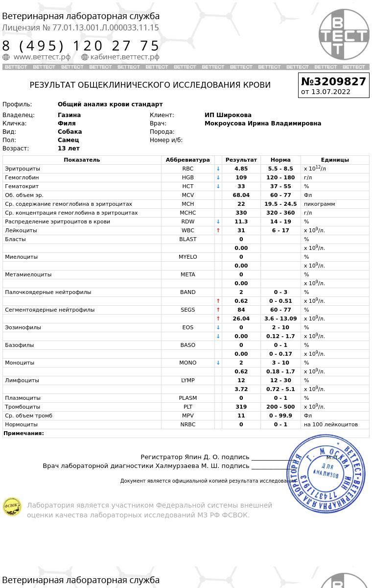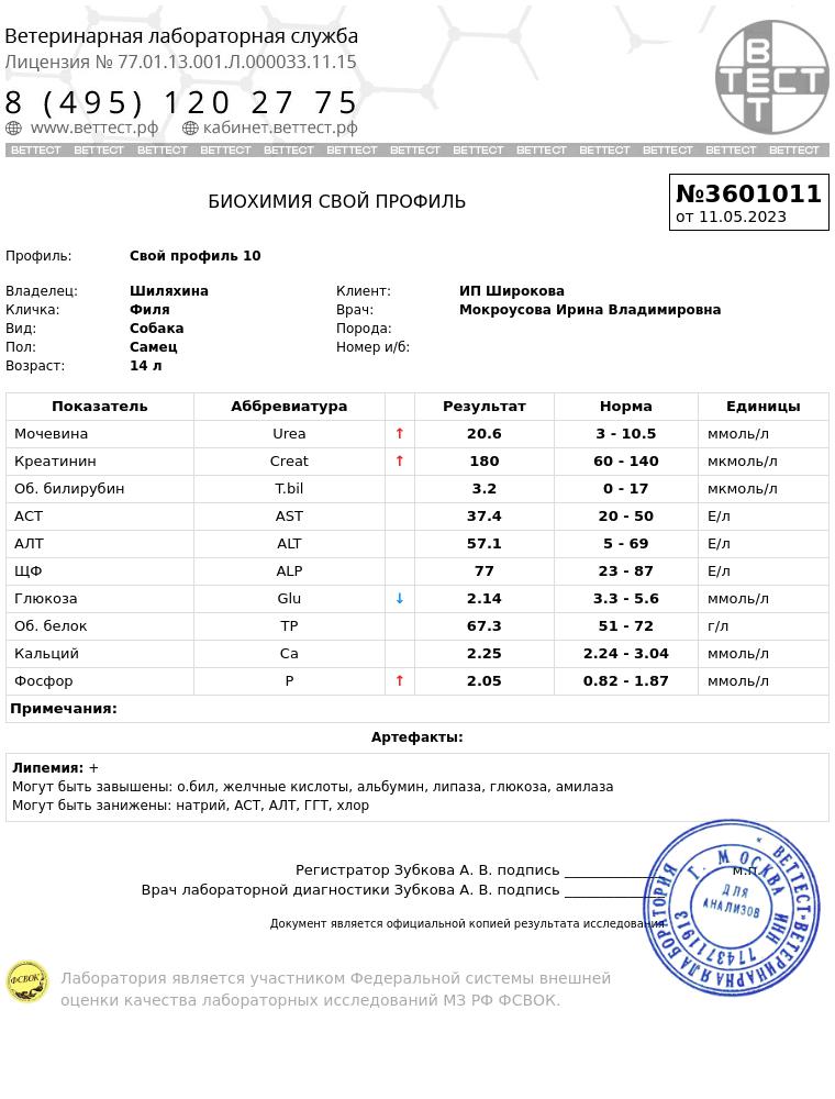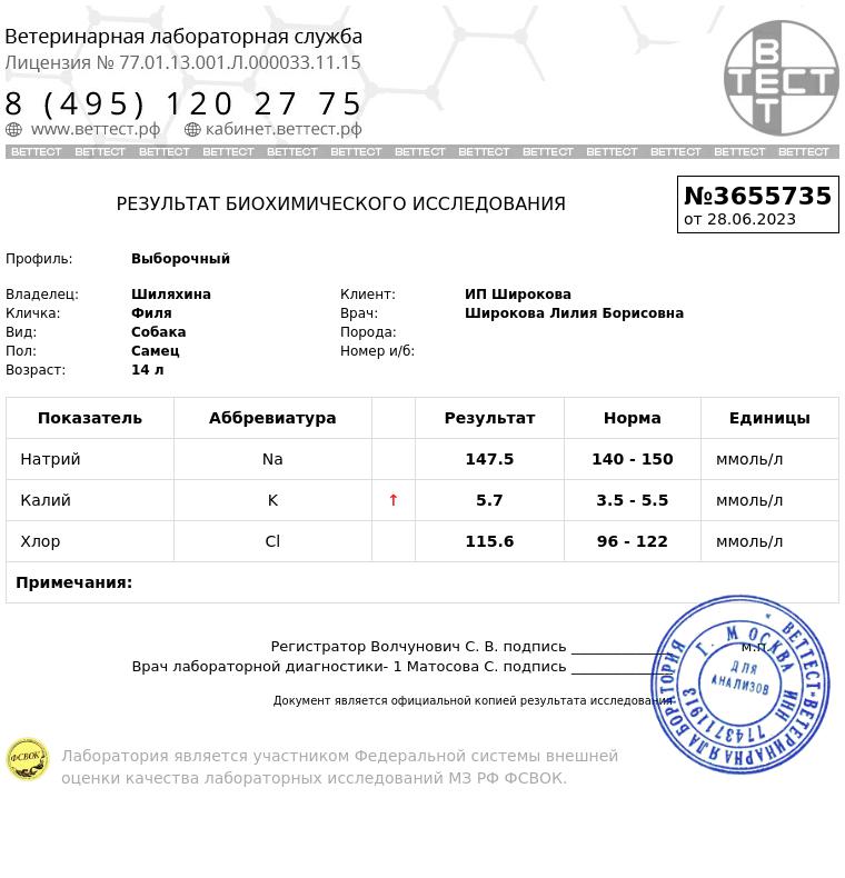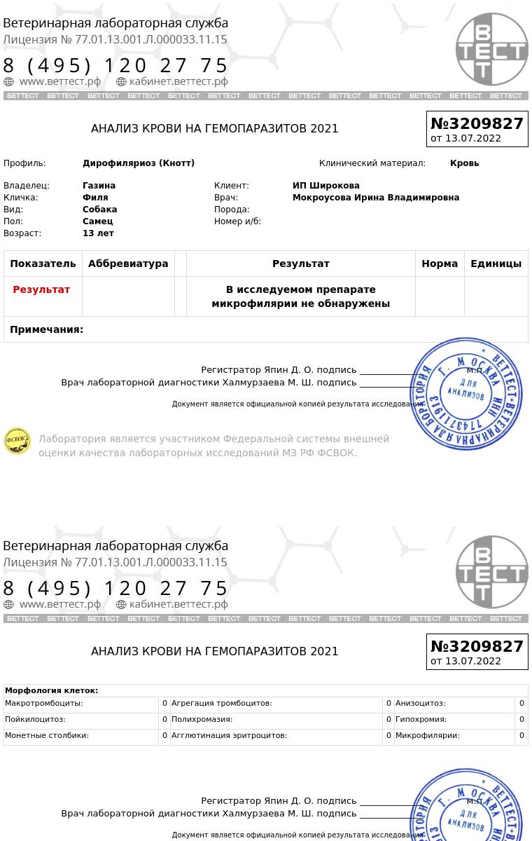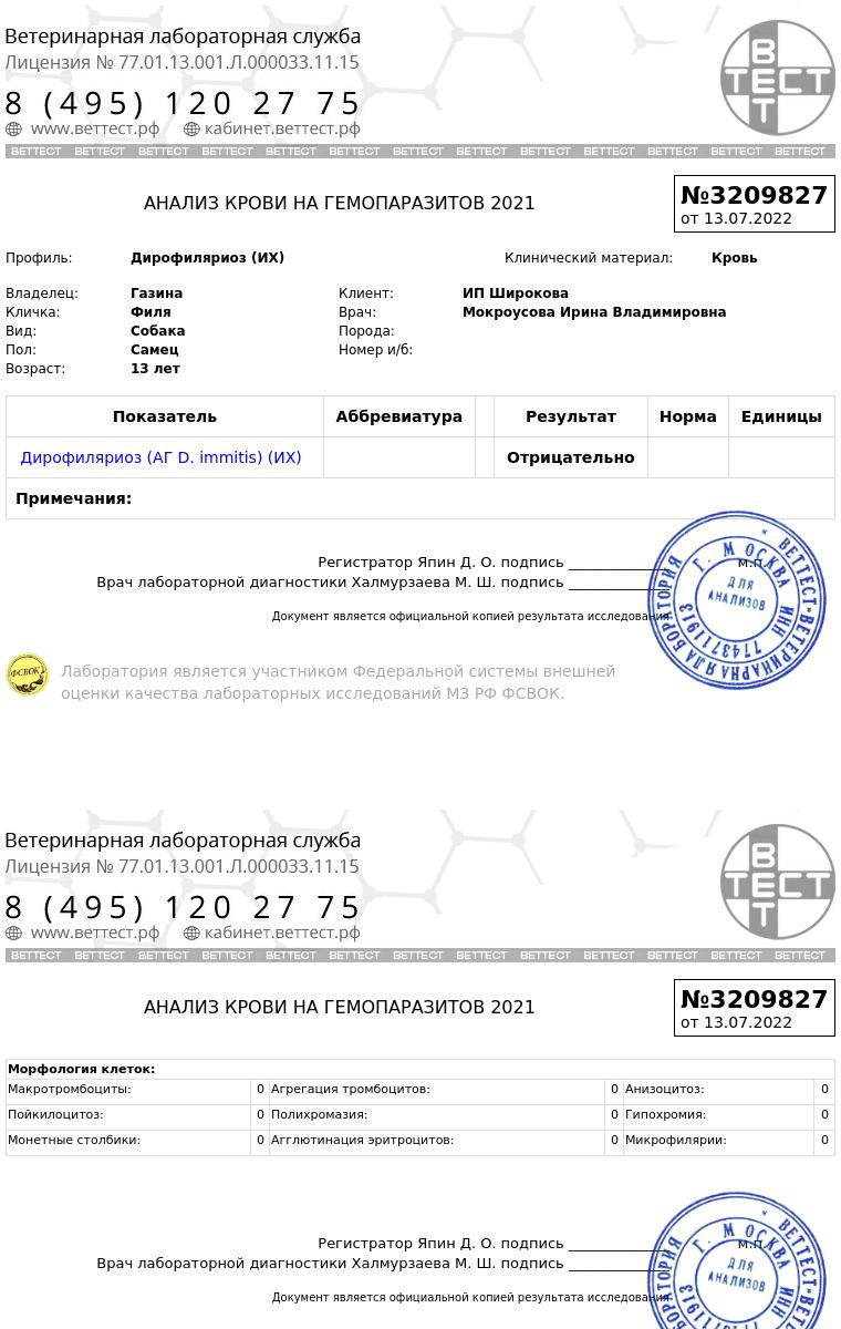 Сдаем кровь: клинический стандарт, дирофиляриоз (ИХ и Кнотта), б/х свой профиль 10, йонный комплекс, щитовидная железа собак, гемопаразитарный 2 - 4400₽