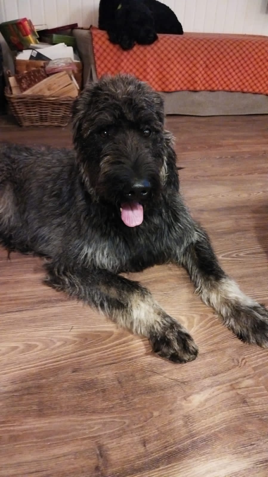 Шерсть у него хорошая, породная, но сейчас нужен тримминг. Украшалка небогатая или обтрепался или обрезана. Щиплется руками отлично. Вонючий, грязный жутко. Привязала в гостиной к столбу, бьётся как муха. Выспался и желает движухи. Поел жадно, даже добавляла порцию.