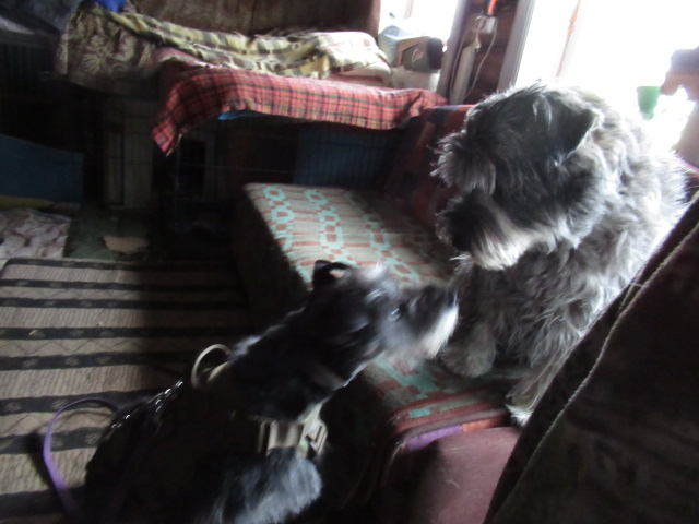 Боня ( он уже реагирует на кличку), метис цверга ч/с. До миттеля он совсем не дотягивает. Весит 10-12 кг. В холке скорее 40-42 см, и Шкипер и Филя его выше.