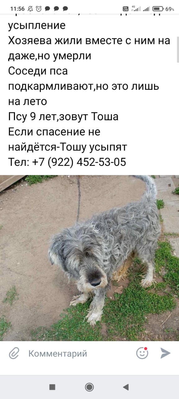 Тошка очень жизнерадостный пес, любил играть с кошками с которыми жил. Ему очень не хватает внимания и ласки. Хозяйка умерла в конце ноября 2022, а хозяин в апреле этого года. С тех пор он живет в одиночестве. Соседи подкармливали, немного обстригли лохмы с колтунами, но ему теперь нужна хорошая, стильная стрижка и он будет вообще красавец! А самое главное нужны внимательные и любящие хозяева!!!
